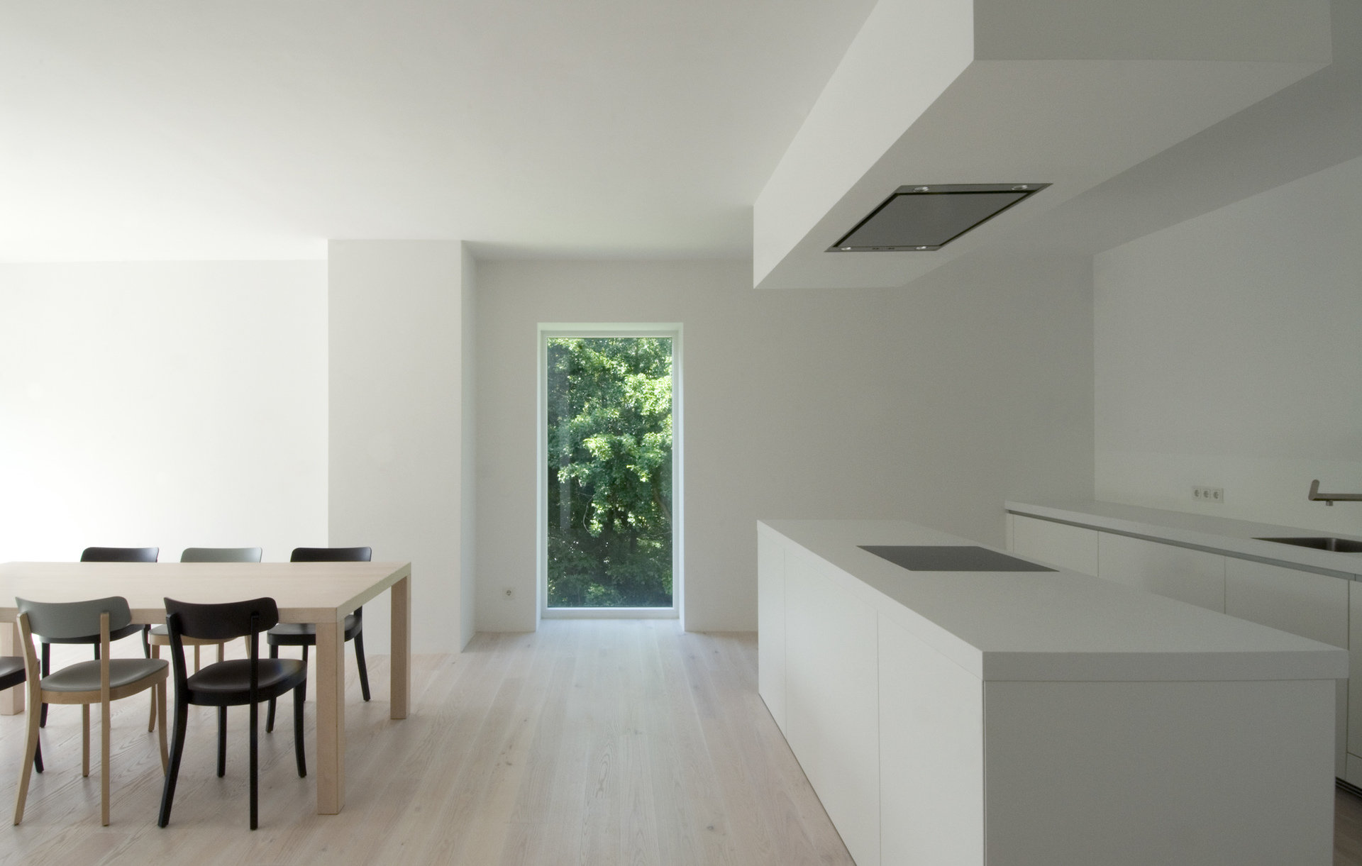 Im Inneren konnte die Wohnebene im Erdgeschoss erweitert werden. Die offene Raumsituation schafft einen fließenden Übergang zum Licht durchfluteten Vorraum. Küche, Essen und Wohnen werden über Eck organisiert und sind über großzügige Verglasungen an die vorgelagerte Terrasse angebunden. Zudem wird Ost-seitig eine kompakte Gästeeinheit geschaffen. Die bestehende Steintreppe ins Untergeschoss konnte trotz Erneuerung der Bodenplatte erhalten werden. Dort werden 3 Garten-seitig ausgerichtete Schlafzimmer geschaffen mit einer indirekt über raumhohe Glastüren belichteten Diele. Ost und West-seitig sorgen große Verglasungen für ausgewählte Blicke ins Grüne und erzeugen ein großzügiges, modernes Raumgefühl. (Text: Architekt)