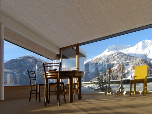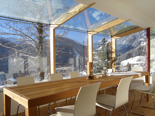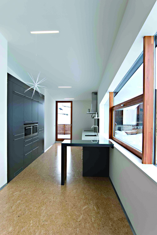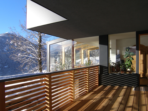 Die Außenansicht des Gebäudes erscheint wie ein auseinandergebrochener Felsblock, in dessen Hälften sich je zwei Wohnungen befinden. Der in abstrahierter Form als „Gletscherspalte“ ausgebildete Bruch zwischen den Bauteilen dient als überdachter Vorraum. Die Außenfassade passt sich mit den anthrazitgrauen FunderMax-Platten, die mit der Zeit wie Stein wirken, an die umgebende Bergwelt an. Die bewusst gewählte Dachschräge ist eine Anlehnung an die traditionellen Häuser der Region. Große Glasflächen in den beiden übereinanderliegenden Wohnungen gewähren Ausblicke auf das umliegende Panorama: im Süden auf das Wetterkreuz und im Westen auf die Bergerkogelgruppe.