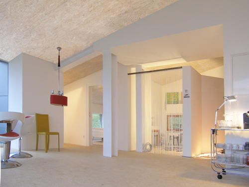 Im Bestand wurden die Wohnräumlichkeiten der Eltern im Erdgeschoß um einen verglasten Wintergarten erweitert, angrenzend entstand eine 74 Quadratmeter große Wohnung mit komplett offenem Grundriss. Auch in der darüberliegenden Wohnung des Architekten samt Atelier ist ein Schlafzimmer offen, das zweite durch skulpturale, nicht raumhohe Wände abgetrennt. Der Innenraum wird durch die holzähnliche Oberflächenstruktur der weißen Flächen geprägt und dadurch als begehbare Plastik erlebbar gemacht. Die ostseitig orientierte Wohnung verfügt über einen eigenen Zugang mit Außentreppe. Im Untergeschoß befinden sich auf Vorplatzebene die Garage, eine Werkstatt sowie Keller, Lager- und Heizräume. (Text Architekten, redaktionell überarbeitet)