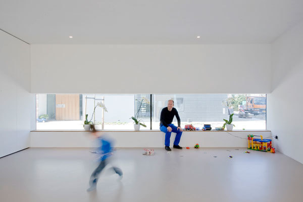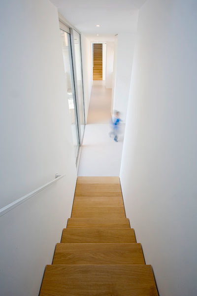 Auf dem konisch zulaufenden, nach Norden orientierten Reststück eines städtischen Baublocks gelang es pasel.kuenzel architects erneut, mit V12K0102 ein außergewöhnliches Wohnhaus im innerstädtischen Kontext zu realisieren. Auf einem 30 Meter langen eingeschossigen Baukörper ruhen gegenübergestellt zwei separate Volumen, das „Haus der Kinder“ und das „Schlafhaus“ für die Eltern. Beide Gebäudeteile stehen über die gemeinsame Dachterrasse oder über die sich gegenüberliegenden Treppen in Bezug zueinander. Die gemeinsam genutzten Bereiche zum Wohnen, Kochen und Spielen, gruppieren sich im 30 Meter langen Erdgeschoß um zwei ins Volumen eingeschnittene Höfe und ermöglichen so einen direkten Übergang zwischen dem Leben im Inneren und der Nutzung des Außenraums. Zur Stadt nimmt das Haus durch zwei 6 und 8 Meter lange horizontale Glasflächen Kontakt auf, die einerseits besondere Ein- und Aussichten zulassen und die andererseits das gleichmässige Nordlicht tief in die fast schon musealen Räume fallen lassen. (Text der Architekten)