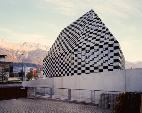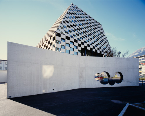Die auffällige Form gibt dem Gebäude Präsenz im Wirrwarr der frequentierten Vorstadtstraße. Köberl stellt sie in Bezug zu anderen markanten Baulichkeiten in der weiteren Umgebung, wie der weithin sichtbaren Allerheiligenkirche von Clemens Holzmeister, Josef Lackners Schule am Fürstenweg oder dem ehemaligen Pulverturm, der in Verlängerung der Achse des Mitterweg beim Flughafen liegt. Die sichtbare Gebäudehülle ist ein durchlässiger Filter, der das eigentliche – verglaste – Gebäude umhüllt.