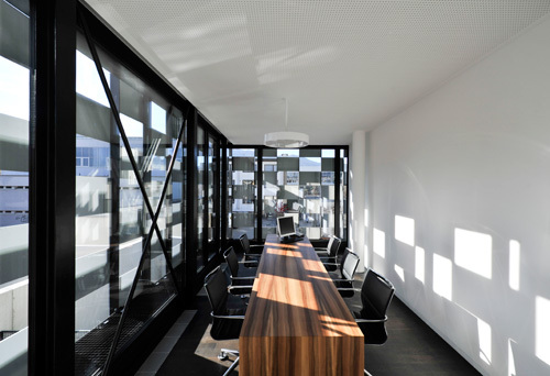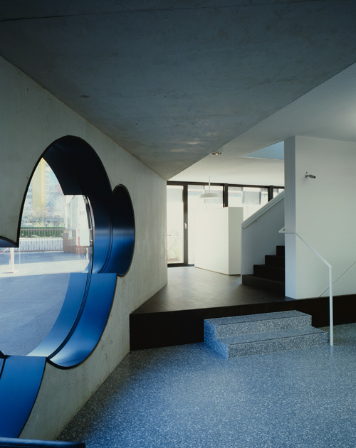 Geerdet wird die luftige Figur durch eine Betonwand, die sich um das Gebäude windet. Sie begleitet die Zufahrt in die Tiefgarage und umgrenzt zwei Refugien im Freien: ein begrüntes Atrium an der Rückseite und eine mit zwei Fächerahornbüschen ausgestattete Terrasse, die östlich an die Besprechungsräume im Obergeschoß anschließt. Die verbaute Fläche ist knapp, Köberl wusste sie raffiniert zu nutzen und hat das Kunststück zuwege gebracht, dass sich das Gebäude von innen größer anfühlt als von außen, dies auch dank einer schlichten, aber edlen Innenausstattung mit Böden aus grau-weißem Terrazzo und von Köberl maßgeschneidert entworfenem Mobiliar im Schalterbereich. „Hirnförmiges“ Nussholz hat der Architekt hier sinnigerweise eingesetzt, und damit spielt er auch auf das bei Bankgeschäften notwendige Vorausdenken an, wie auch der karierte Schleier als Metapher für das „durchaus nicht nur sichere, sondern auch fragile Bankwesens“ zu deuten wäre.