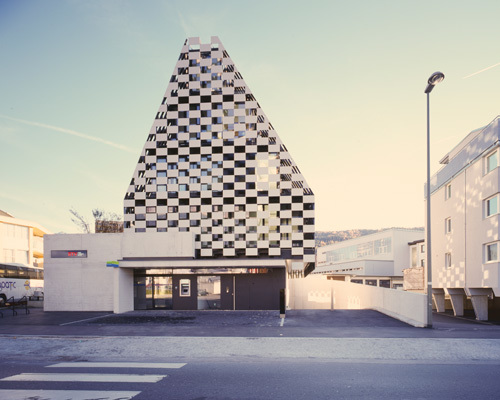 Sie besteht aus schachbrettmusterartig auf einer Stahlkonstruktion angeordneten Platten aus glasfaserverstärktem Beton, deren Größe variiert, um trotz der geneigten Flächen durchgehend die horizontalen Linien beizubehalten. Der weiße Schleier wirft Licht-Schatten-Muster auf die Umgrenzungsmauer und in die Innenräume. Er schützt vor Einblicken und bewahrt von innen vor dem direkten Blick auf die wenig attraktive Nachbarschaft, lenkt diesen aber auch durch einzelne Fenster in die „schöne“ Umgebung – auf die Berge und in den Himmel.
