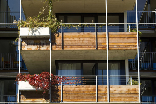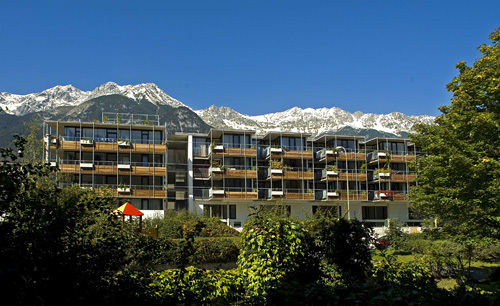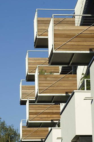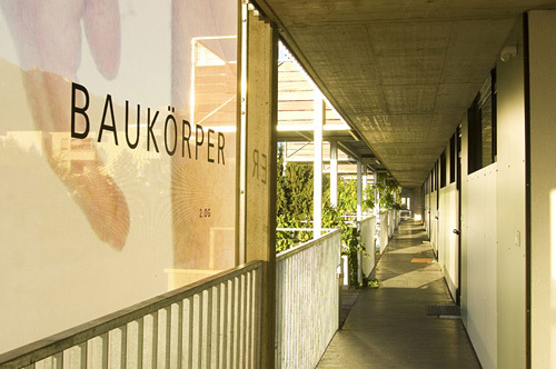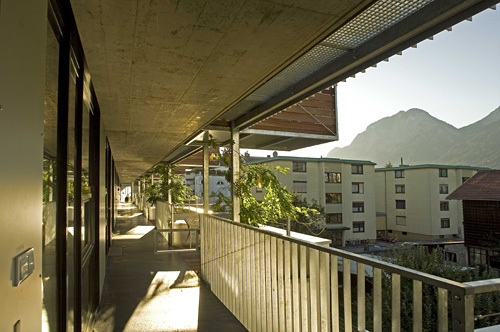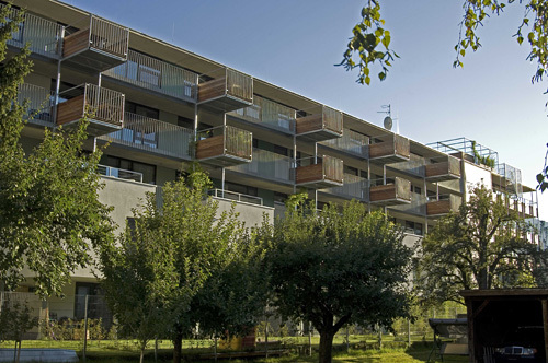 Die über diesen „Häusern“ liegenden Wohnungen werden vom Hauptzugang im Zwischenraum des zweigeteilten Baukörpers aus über breite, benütz- und bewohnbare „Straßen“ geschossweise erschlossen. Auskragende Terrassen schaffen hier Kommunikationszonen bzw. kleine, halböffentliche Plätze, die sich etwa dazu anbieten, die Abendsonne zu genießen. Die Grundrisse der großteils 50 m² großen Wohnungen sind so flexibel gehalten, dass sie sowohl als großzügige Einraum-Wohnung als auch mit 1 bis 2 Schlafzimmern bewohnt werden können. Jeder Wohnung ist neben einer Terrasse, zu der sich die Wohnräume mit raumhohen Flügeltüren öffnen, ein sogenannter „Luftgarten“ zugeordnet, ein zwischen den Terrassen liegender, privater Luftraum. (Text: Claudia Wedekind)