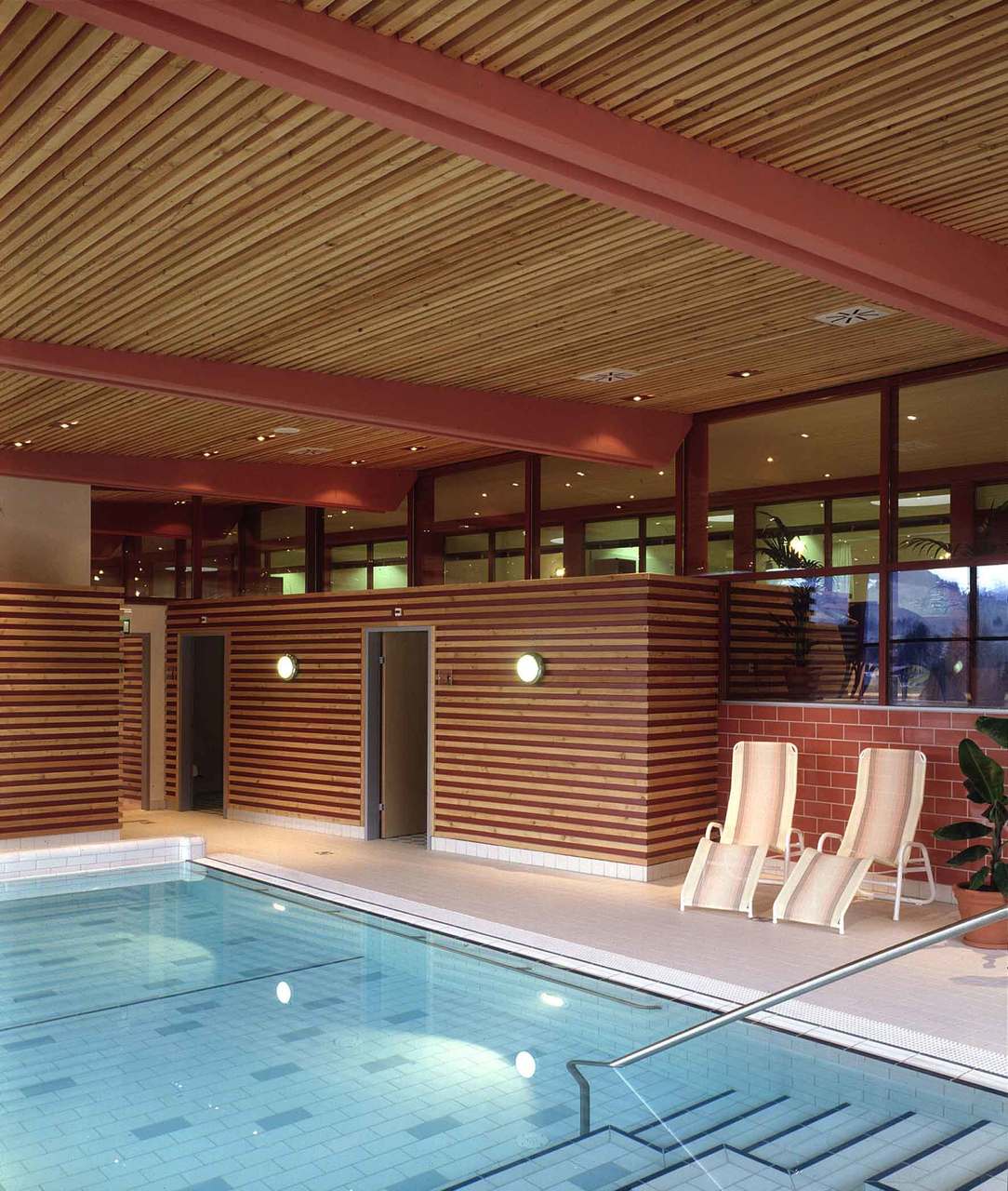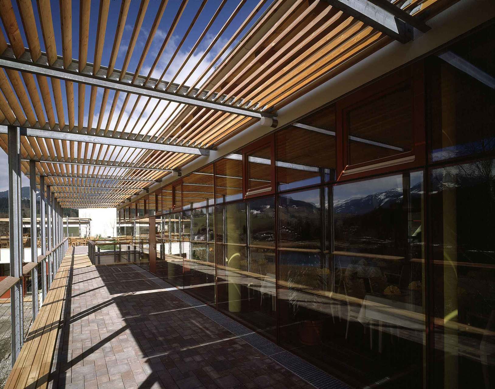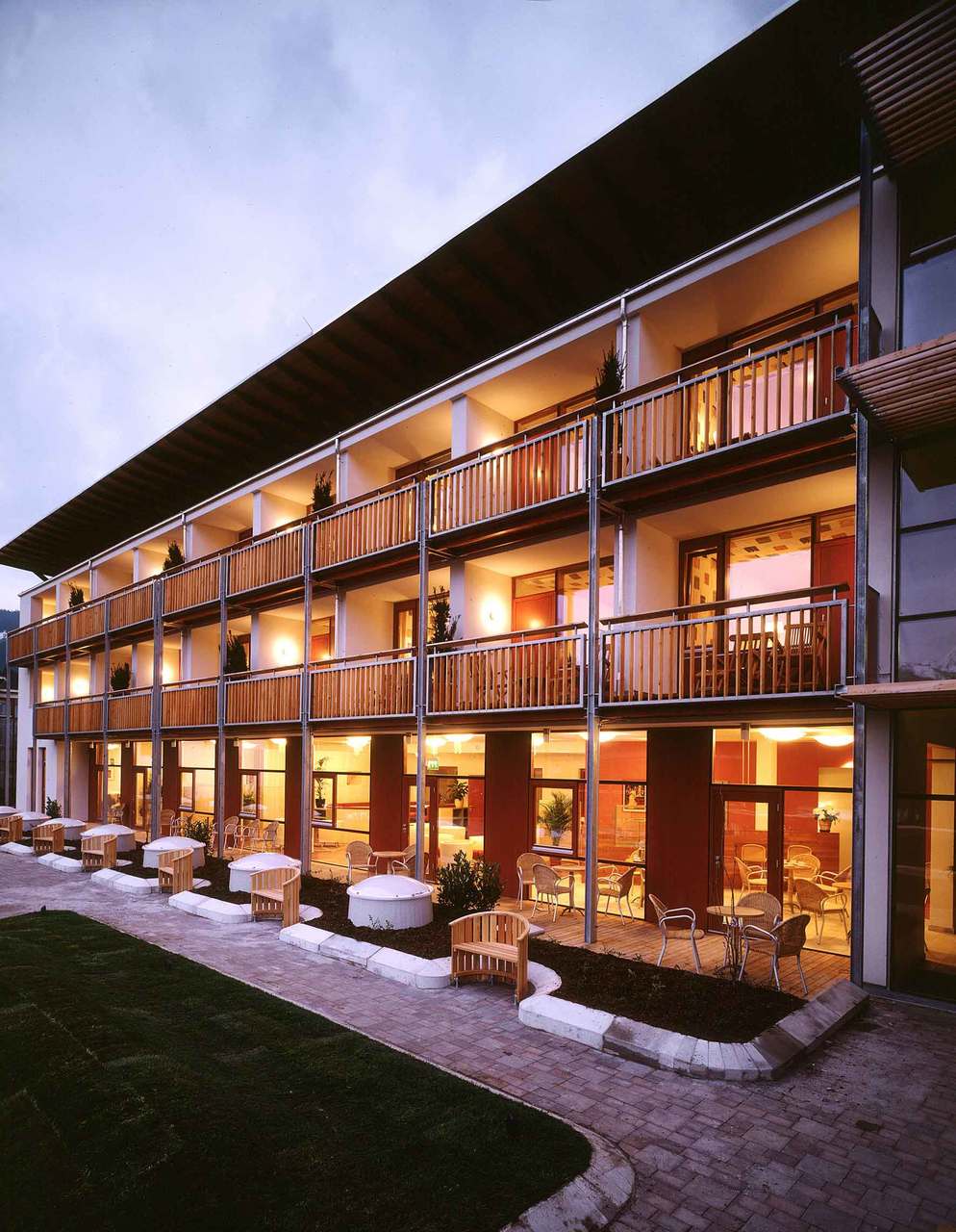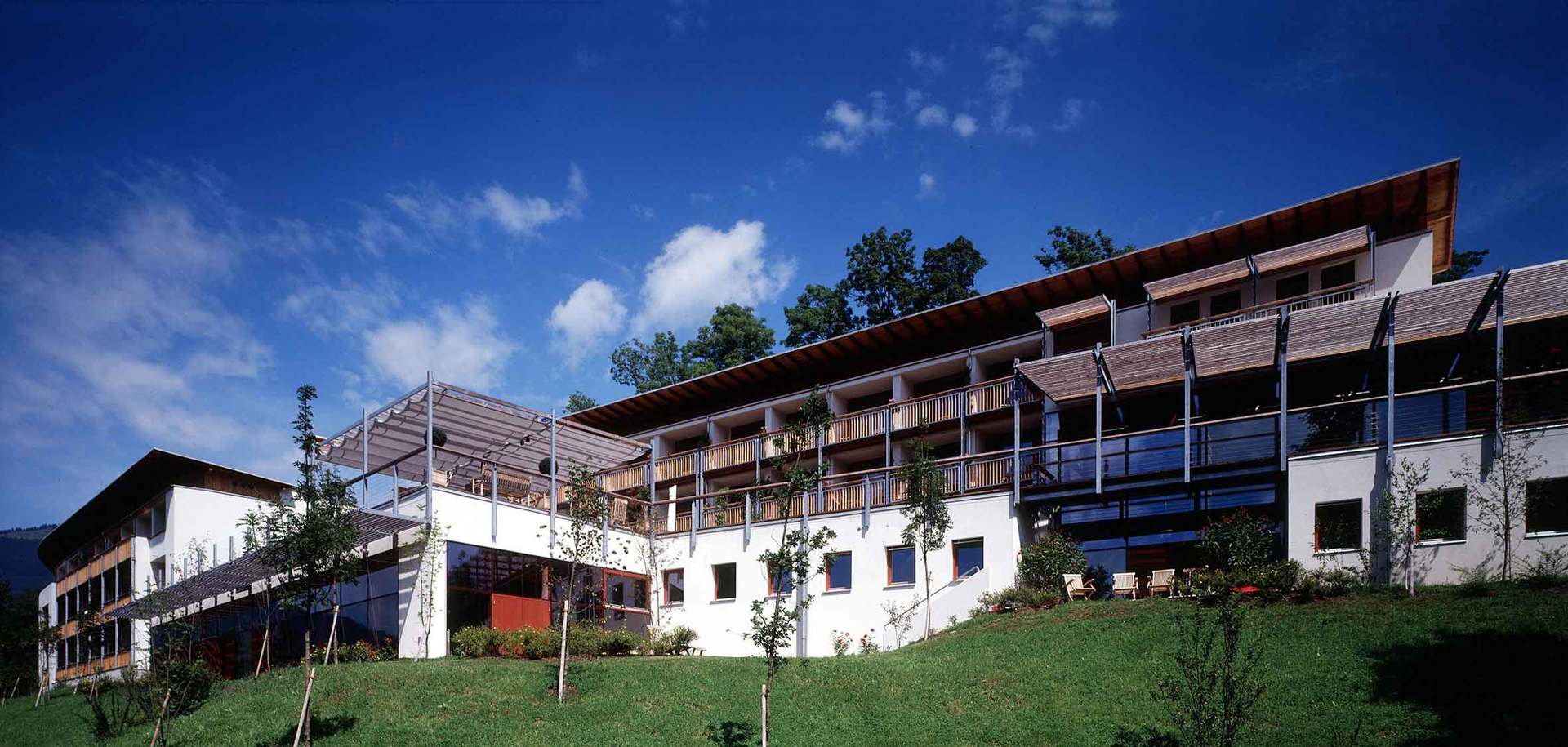 Bei einem EU-weiten Bewerbungsverfahren für den Umbau bzw. die Erweiterung zum Beherbergungsbetrieb mit 80 Betten setzten sich die Salzburger Architekten mit einem intelligenten Konzept durch. Obwohl sich die Kubatur um ein Drittel erhöhte, konnten Resmann & Schindlmeier die Bestandsbauten der Nachkriegszeit so integrieren bzw. erweiterten, dass das entstandene Bauensemble nun in die Hangsituation eingebettet ist und großzüge wie helle Gemeinschaftsbereiche bietet. Das Dach des neuen, gartenseitig vorgelagerten Therapiebereich nimmt die großzügige Südterrasse mit Pergola und Sonnensegel auf. Die Architekten erweiterten den bestehenden Bettentrakt – die Topografie nachzeichnend – bogenförmig und ersetzten die mächtigen Satteldächer durch filigrane Pultdächer: Im Gegensatz zu früher erscheinen nun die horizontal lagernden Baukörper landschaftlich eingebunden. (Text: Norbert Mayr)