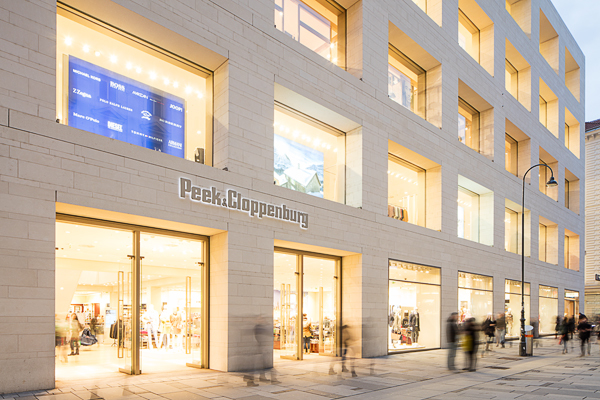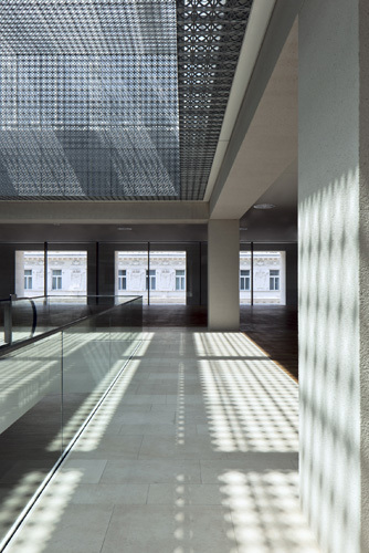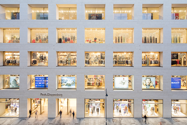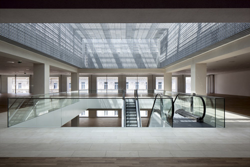 Die Fülle des gemauerten Natursteins macht es nicht leicht, über die gewaltige Masse hinweg auch die Gliederung des Gebäudes wahrzunehmen. Ist ein Schattenspiel als gliederndes Element in einer Stadt, in der plastische Gestaltungselemente, Vor- und Rücksprünge das Erscheinungsbild prägen, lesbar? Das Gebäude wird als monumentaler Baublock wahrgenommen, der die Maßstäblichkeit des Straßenzuges sprengt, sofern das Gebäude in seiner Gesamtheit überhaupt erfasst werden kann, denn die Grundfläche des Gebäudes erstreckt sich über drei Bauplätze und die Breite der Straßenfront übersteigt das Sehfeld des Betrachters, der sich dem Eingang nähert. Im Verkaufsraum wird der Blick nach oben gelenkt. Tageslicht dringt durch die Lichtkrone in das Kaufhaus. Wer den Weg ins oberste Geschoss zurückgelegt hat, entschlüsselt dort ein filigranes Muster: Unzählige Kreisbögen verdichten sich zu einem Ornament aus Aluminiumguss und schmücken die Lichtkrone, die Tageslicht auf 4 Ebenen spendet. (Text: Martina Frühwirth)