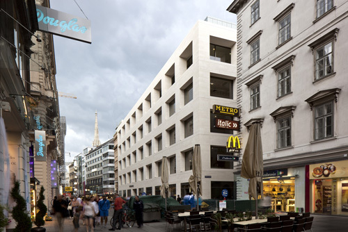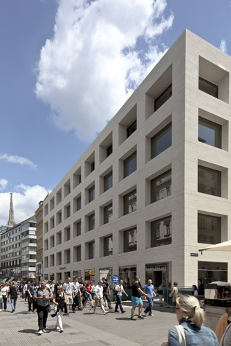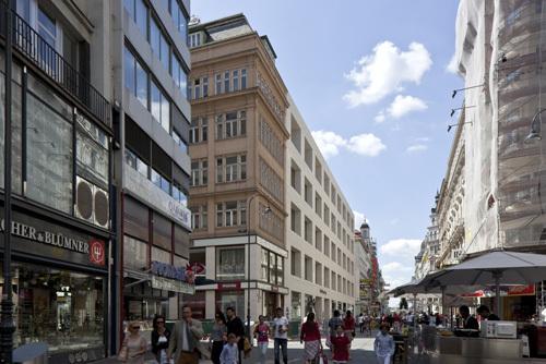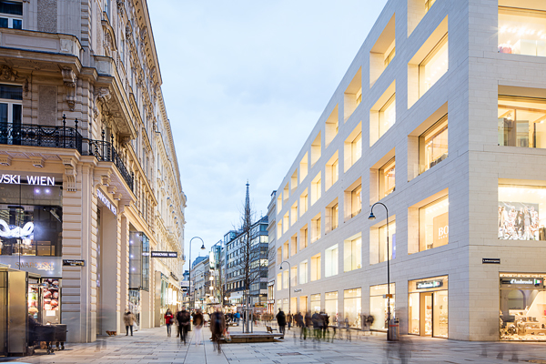 Im Unterschied zur Stadt Wien, die im Zuge einer Generalsanierung die Kärntner Straße im Jahr 2009 mit historisierenden Straßenlampen (Stichwort „Maiglöckchen“) ausstattete, verzichtete der Architekt auf jegliche historisierende Anspielung und wählt statt dessen eine subtile Form der Referenz. Zitat Chipperfield: „Im Erdgeschoss schließt die Verglasung der Schaufenster bündig mit der Fassade ab. In den Obergeschossen liegt die Glasebene zurückversetzt, wodurch die Tiefe der Fensterlaibungen sichtbar wird. Das vierte Obergeschoss öffnet sich mit einer Loggia zur Stadt. Die wechselnde Position der Glasebene erzeugt ein differenziertes Schattenspiel und verweist auf die Zonierung der umliegenden historischen Gebäude in Sockel, Haupt- und Gesimszone.“