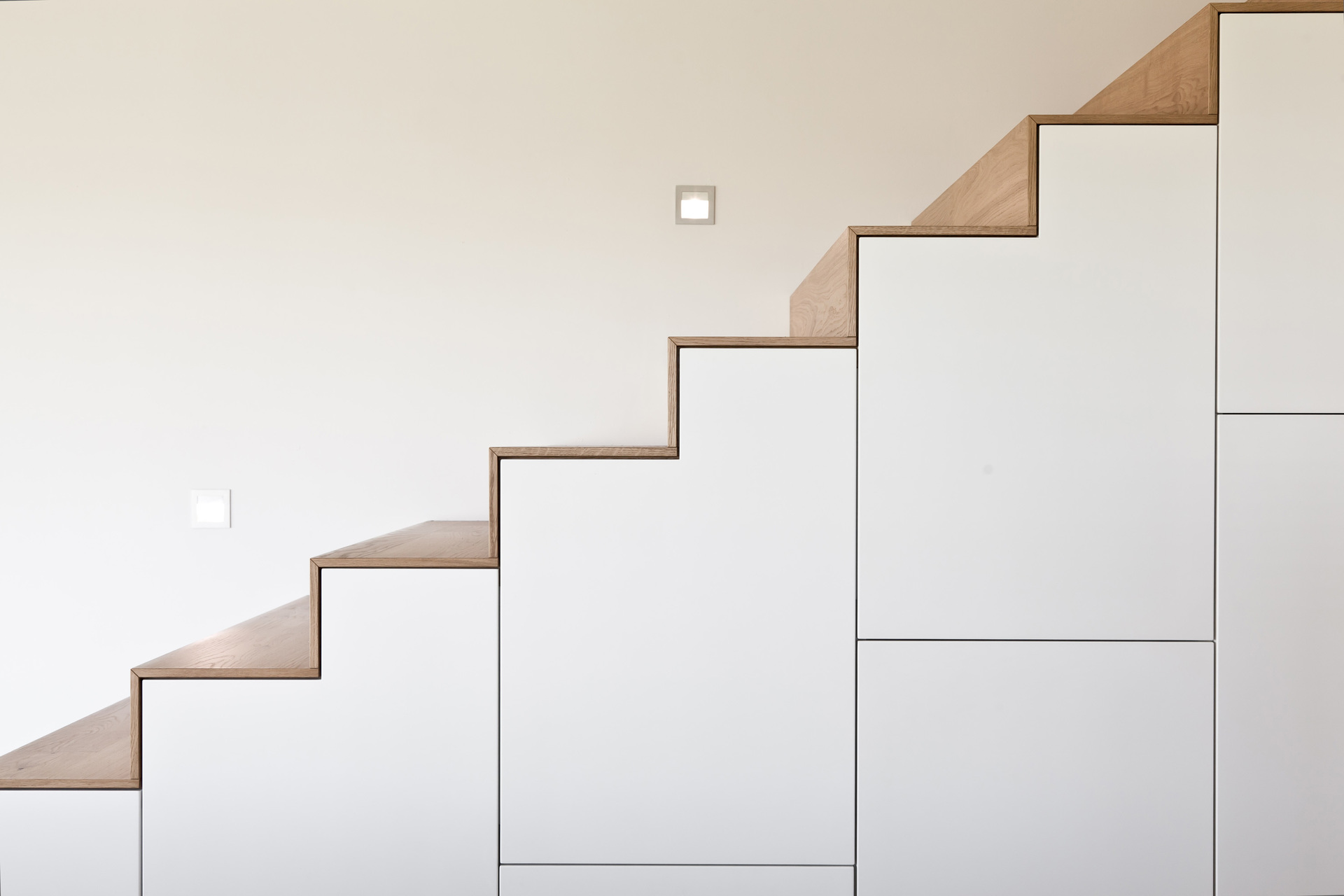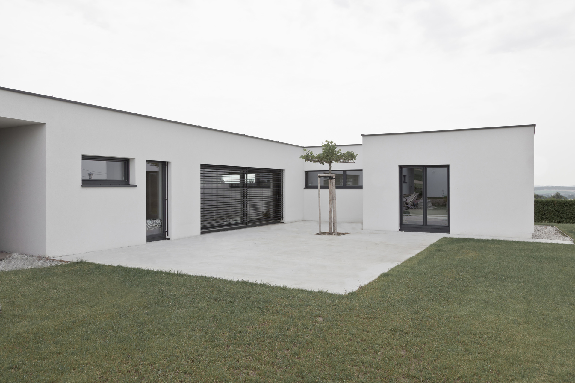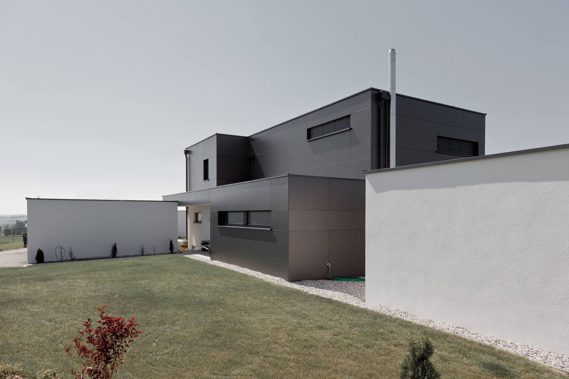 In der äußeren Charakteristik tritt das eingeschossige Gebäude, mit den beiden Garagen, als monolithischer, weißer Baukörper in Erscheinung. Das zweigeschossige Haus, mit seiner dunklen Fassadenverkleidung, vermittelt spannungsvoll zwischen den beiden Baukörpern und lässt so die Individualität der einzelnen Parteien erkennen.