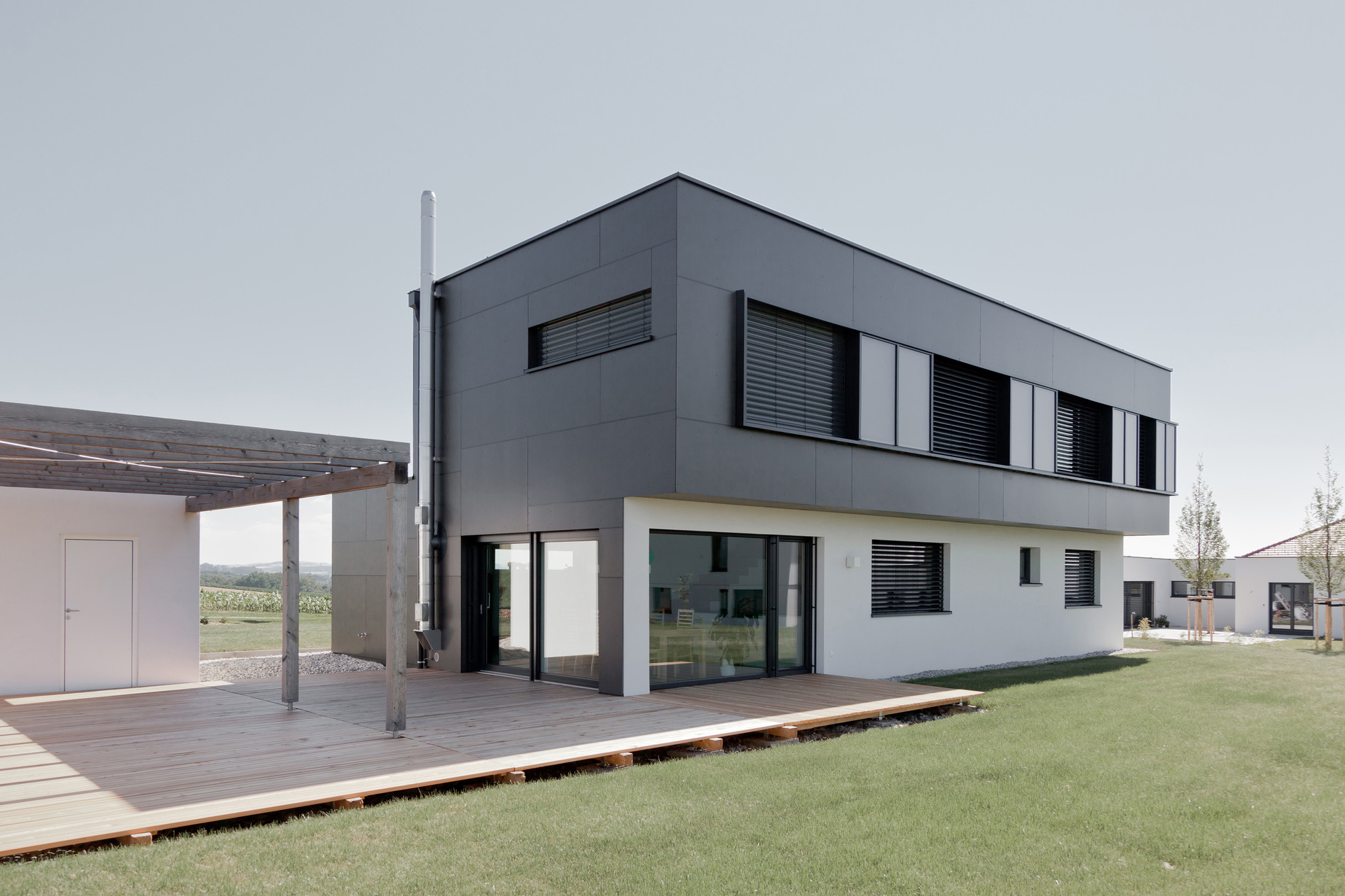 Beide Häuser sind als Niedrigstenergiehaus ausgerichtet, mit Tiefenbohrung und kontrollierter Wohnraumlüftung. Der Bungalow in Massivbauweise mit weißer Putzfassade, das zweigeschossige Gebäude als Gegenpol in Holzriegelbauweise und dunkelgrauer Fassadenverkleidung. (Text: Architekten)