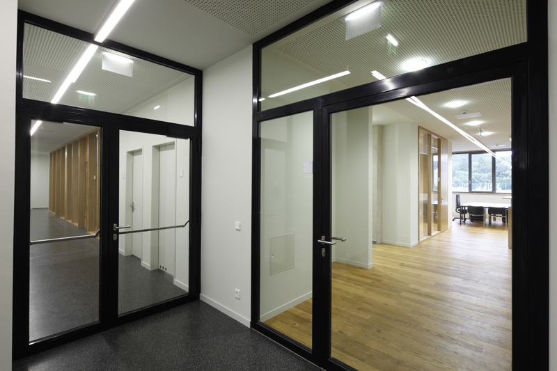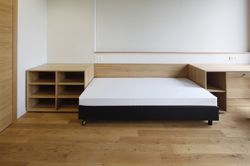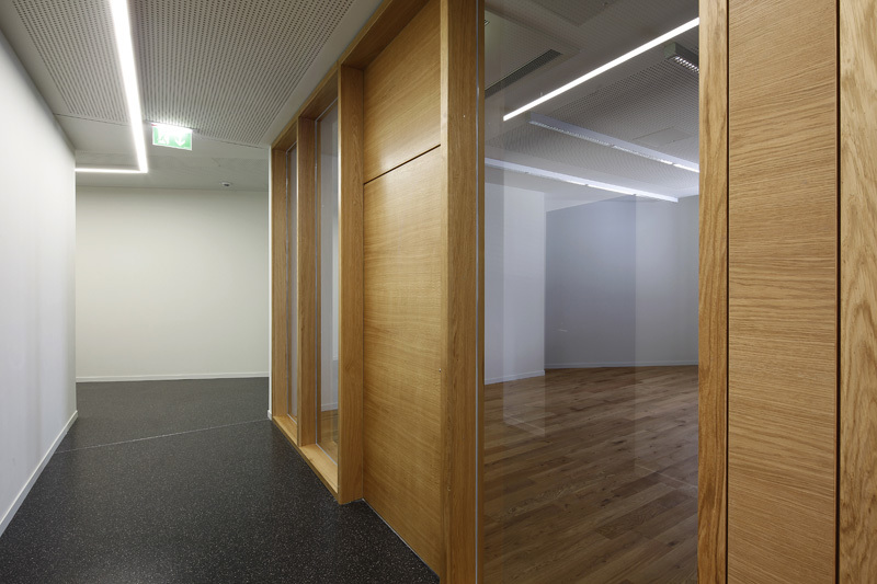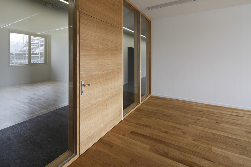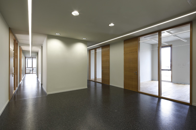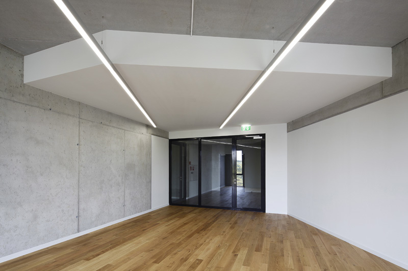 Das Konzept des Ausbaues wurde in Abstimmung mit dem Betreiber erarbeitet. Die Zimmer des Internates wurden zu Duplexeinheiten zusammengefasst: jeweils zwei Zimmer haben einen gemeinsamen Vorraum mit Koch- und Sitzgelegenheit, drei Zimmer wurden als Miniapartments ausgeführt. Besonders Augenmerk wurde auf große Abstellräume für die sportliche Ausrüstung der Bewohner gelegt. Als Materialien wurden Eichenholz natur, schwarzer Kautschuk, schwarz beschichtete ALU-Platten und, korrespondierend mit dem Sichtbeton, der teilweise an Wänden und Decken inszeniert wurde, wurde graues Feinsteinzeug verwendet. In den Sanitär- und Abstellräumen wurde als Farbe am Boden ein kräftiges Grün ausgeführt. Die Zimmer sind mit viel Holz wohnlich und funktionell ausgeführt.
