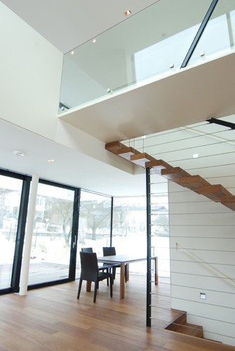 Eine interne Stiege trennt die offene Küche vom Wohnraum und führt direkt in die Bibliothek im Obergeschoss, die durch eine Deckenöffnung in Blickbezug zum Wohnzimmer steht und sich Richtung Westen auf den markanten, die Gebäudekubatur stark beeinflussenden Balkon öffnet. Ein großes Bad, das Schlafzimmer und begehbare Garderoben sind über einen schmale, galerieartige Brücke von der Bibliothek aus erreichbar.