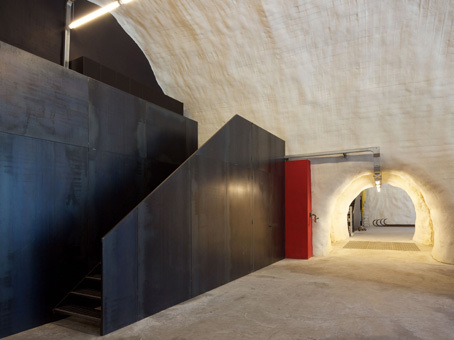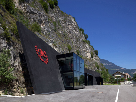 Drei Körper durchdringen die massive Betonwand: der gläsernere Kubus für die Verwaltung und zwei Torelemente, die durch ihren schwarz lackierten Rahmen geschlossen wirken, obwohl sie aus Glasschiebeelementen bestehen und so den Blick auf die dahinter geparkten roten Einsatzfahrzeuge freigeben. (Text: nach einem Text der Architekt:innen)