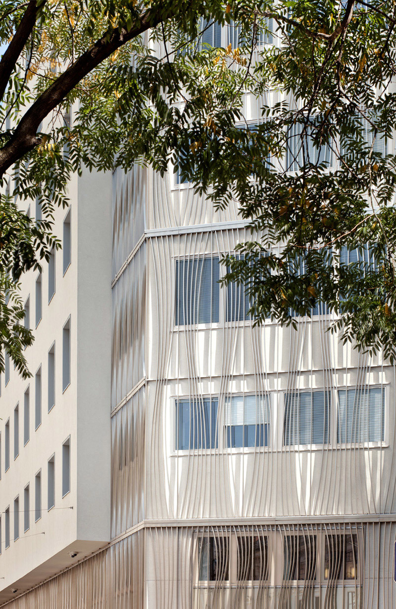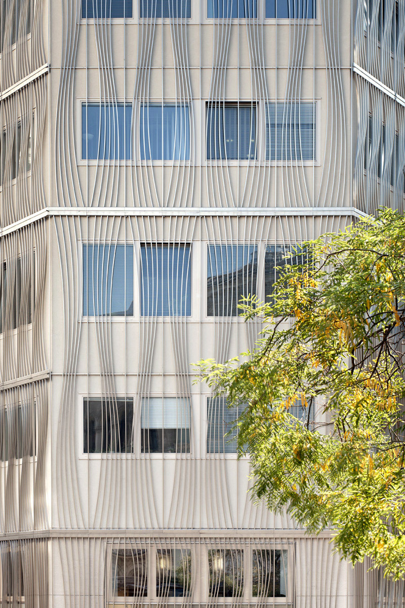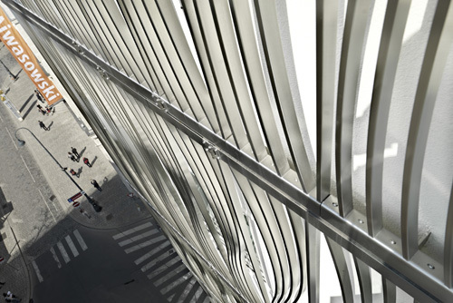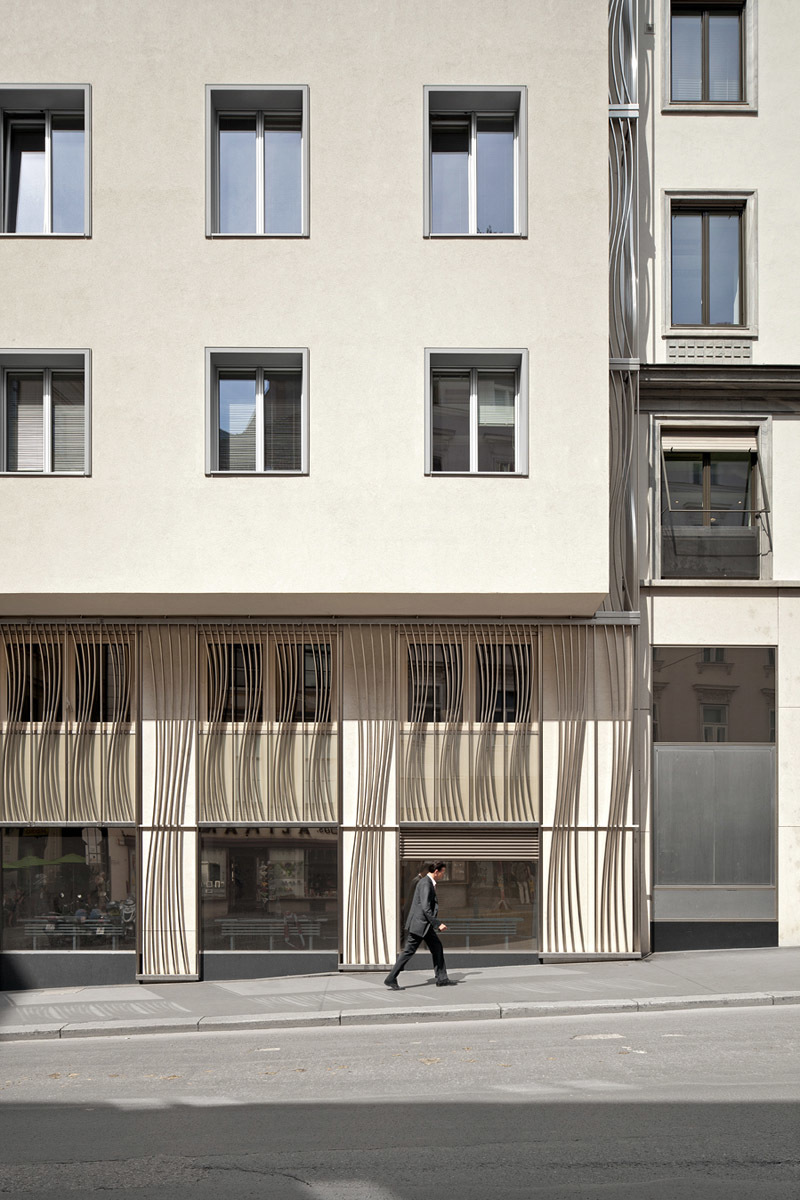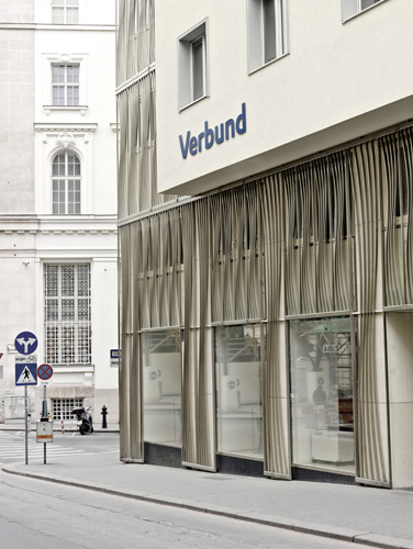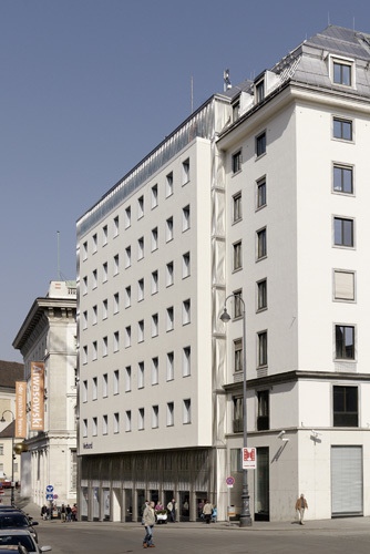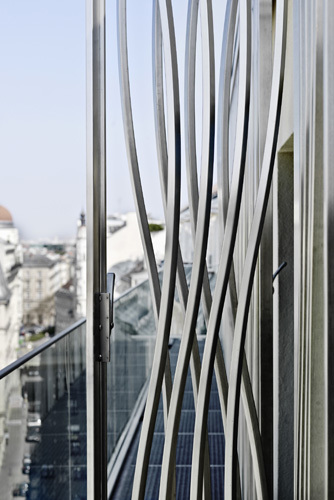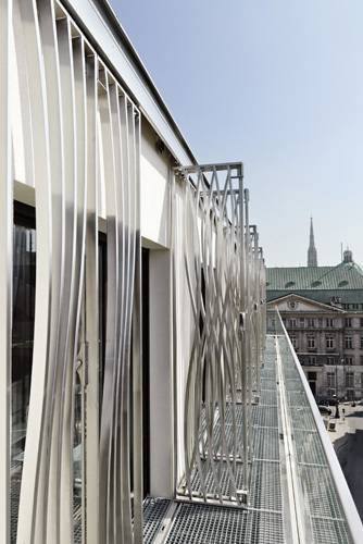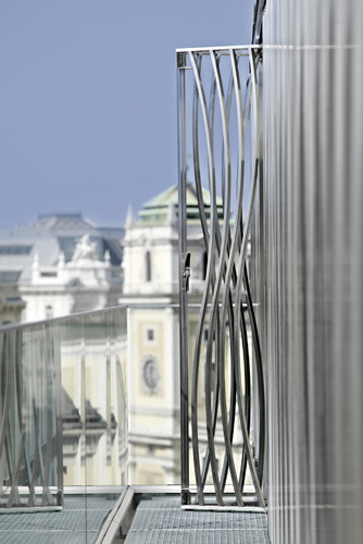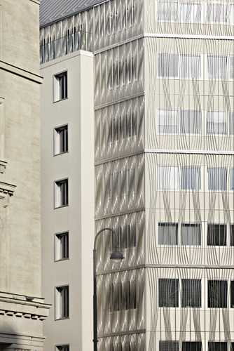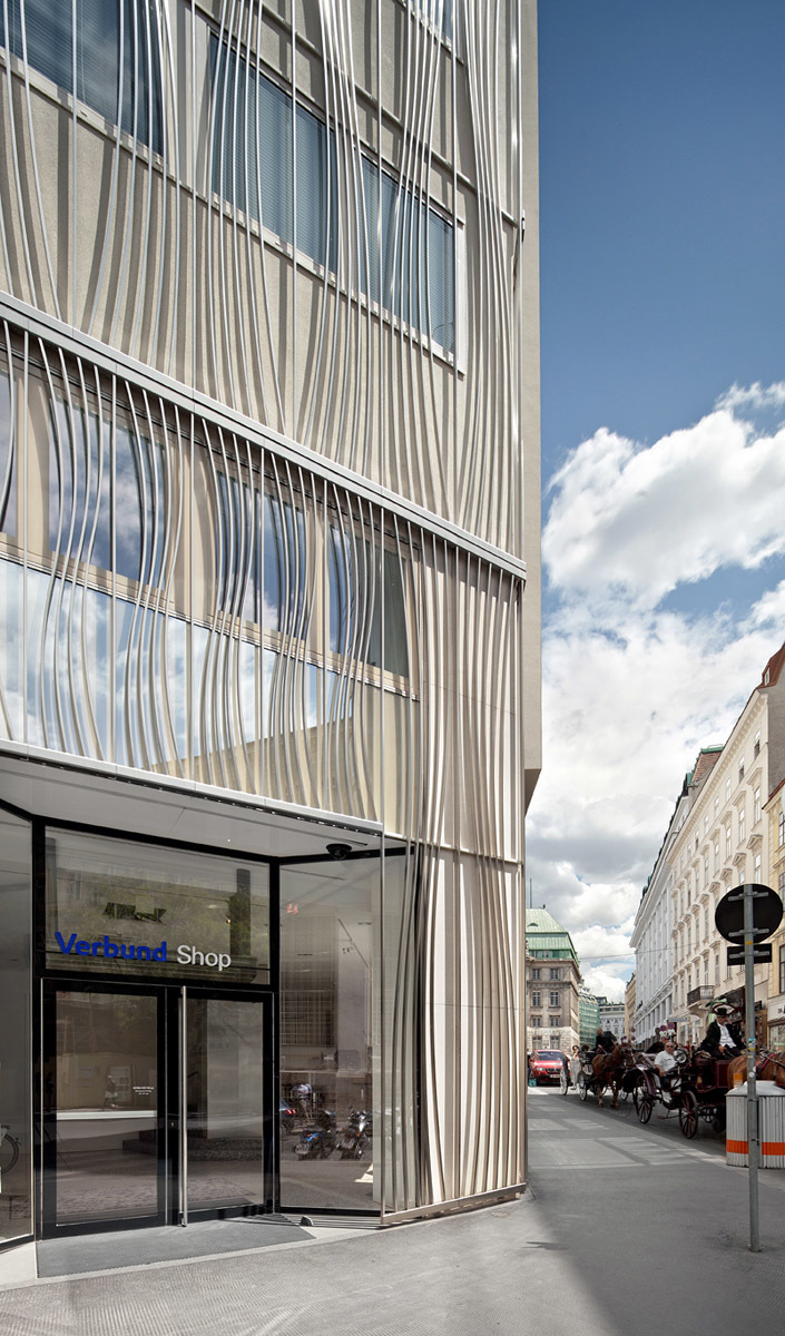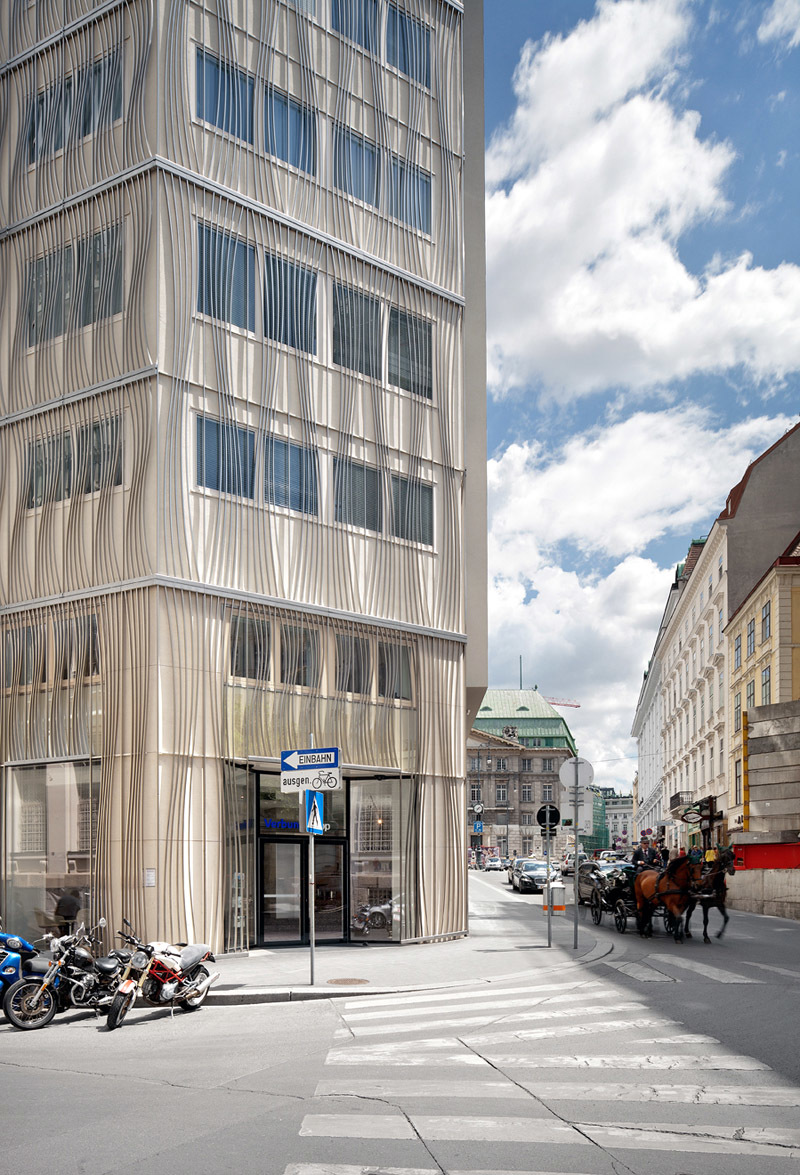 Die Anordnung der Fassadenelemente nimmt Bezug auf die historischen Nachbargebäude: Das Haus hat trotz seiner neun Geschosse dieselbe Höhe wie die umliegenden Gebäude. Neun annähernd gleich hohe Geschosse werden hier durch eine geschossübergreifende Gestaltung auf fünf reduziert und passen das Gebäude an den Maßstab der umliegenden Gebäude an. Mit der Neugestaltung richtet sich das Bauwerk stadträumlich stärker zur Freyung hin aus. Der Eingang in den Shop wurde hier als einziger öffentlich zugänglicher Bereich hervorgehoben.