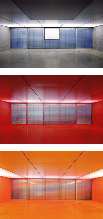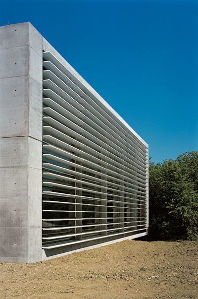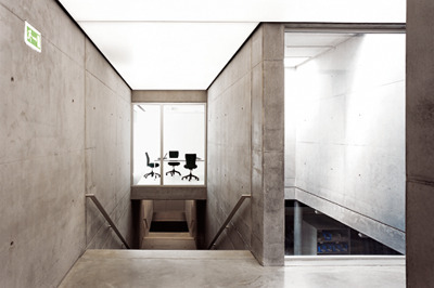 Das strenge, für viele gewöhnungsbedürftige Material des Sichtbetons wurde hier sowohl außen als auch innen verwendet, die Bereiche der Büros sind weiß gestrichen - und zwar von der Decke bis zum Boden. Ebner: „Wir wollten in diese grobe Außenhaut eine innere Schicht einziehen“. Durch den zweischaligen Aufbau der Betonwände ergeben sich wunderbare Möglichkeiten, Leitungen und andere Versorgungselemente unterzubringen, was für einen Elektrobetrieb, der seinen Kunden auch vor Ort die neuesten Technologien vorzeigen will, nützlich ist.