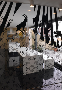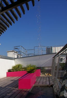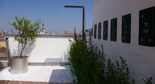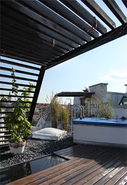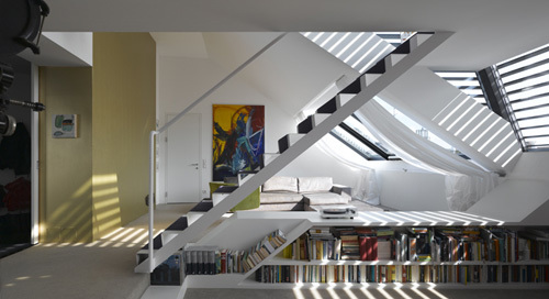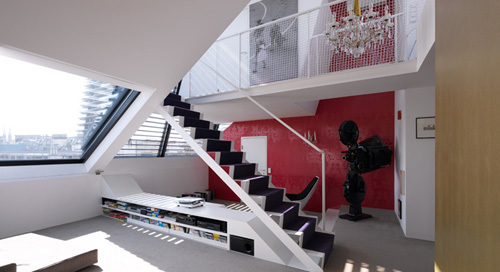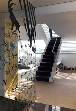 Die beiden großen, hofseitigen Terrassen mit je 33m² sind als eine gemeinsame Freifläche ausgestaltet und verstärken damit den großzügigen Raumeindruck. Hier wirken die Lamellen raumstrukturierend, als Schattenspender und als Rankhilfe der Dachbepflanzung. Die Dachterrasse ist über eine Brücke und eine eingezogene Ebene im Inneren – auf der sich ein Büro befindet - zugänglich. Eine schlanke, elegante Stahltreppe in Weiß verbindet die obere mit der unteren Ebene, auf der sich der Wohnungseingang befindet. Der tageslichtdurchflutete Raum wirkt durch das vorherrschende Weiß zusätzlich freundlich und hell, die Akzentuierung zweier Wände - mit einer pinken Tapete und einem goldenen Anstrich - sorgt für eine warme Wohnatmosphäre.