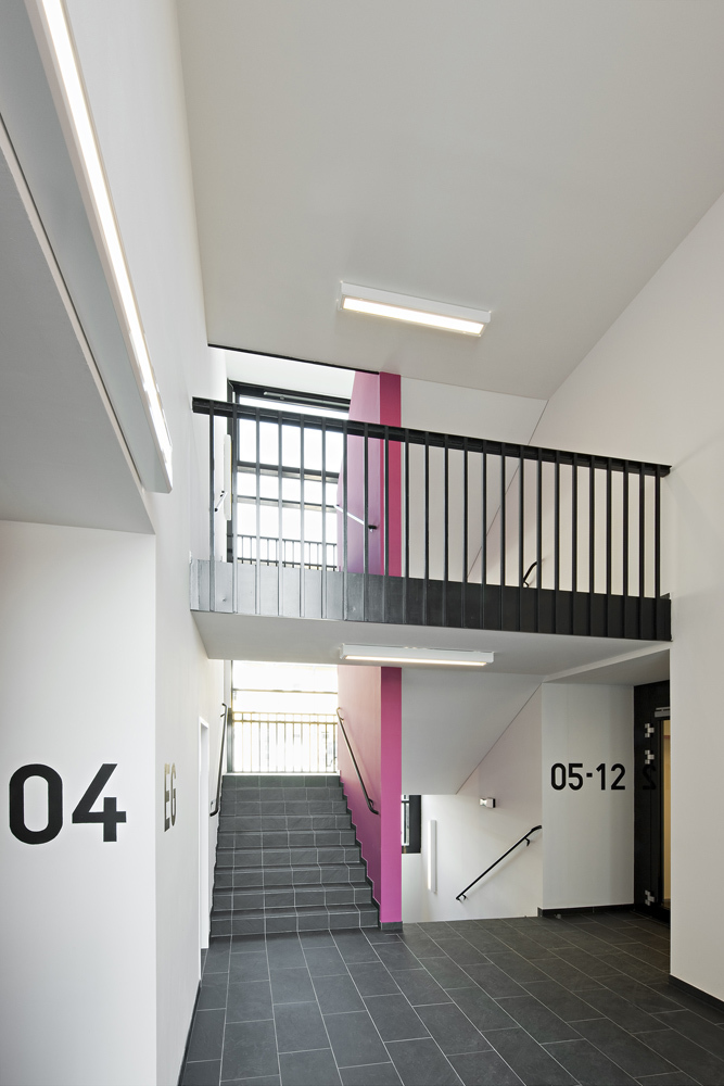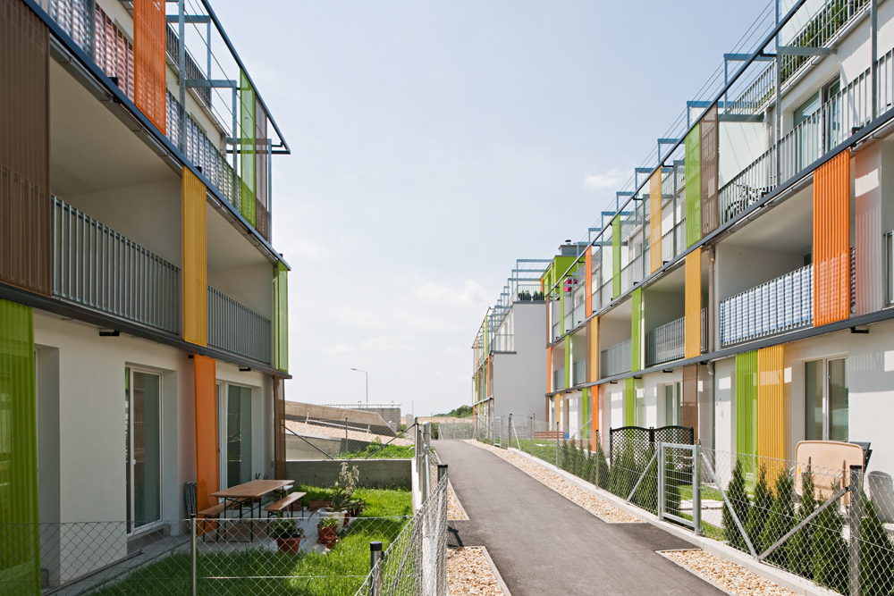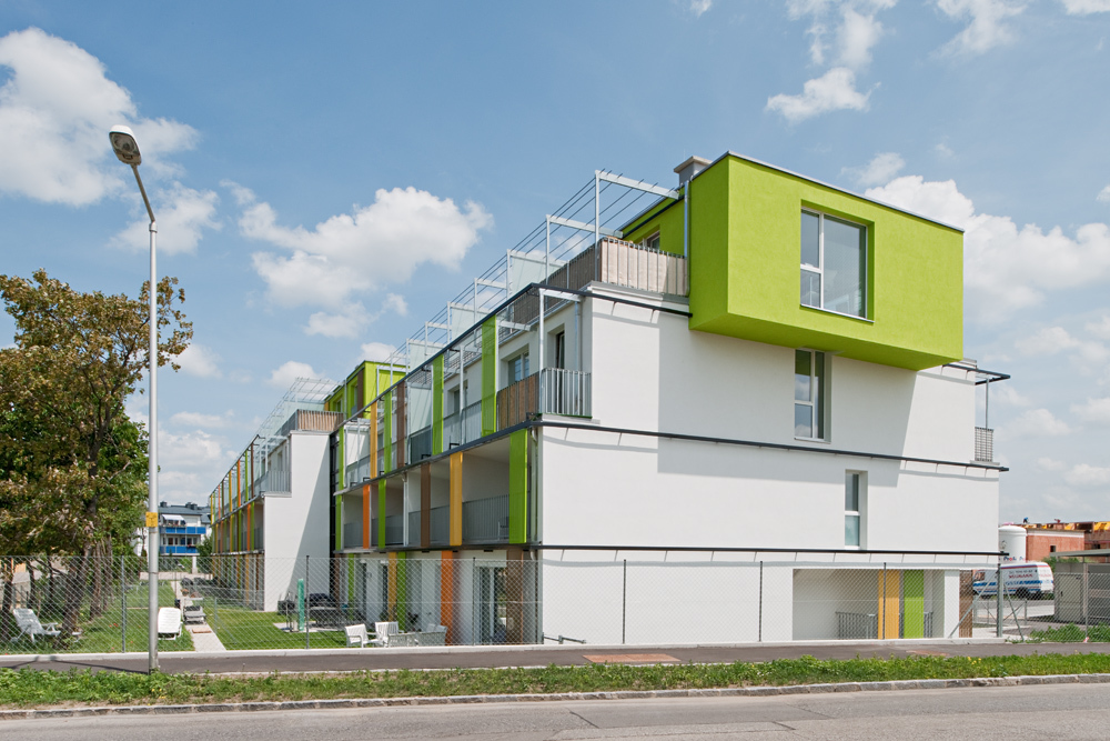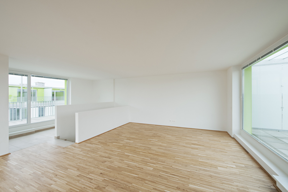 Durch die Orientierung nach Ost und West wird jede Wohnung ideale besonnt und kann quergelüftet werden. Alle Räume liegen an der Fassade, auch die Bäder werden natürlich belichtet. Alle Wohnräume bieten durch Fenstertüren oder breite Fensterfronten großzügige Ausblicke und lassen den Außenraum ins Zimmer hinein. Ebenso sind alle Stiegenhäuser und Gänge natürlich belichtet. Alle 3-Zimmer-Maisonetten in den oberen Geschossen sind mit Balkon und zwei Dachterrassen ausgestattet. Die 4-Zimmer-Maisonetten öffnen sich auf einen Eigengarten und 2 Loggien.