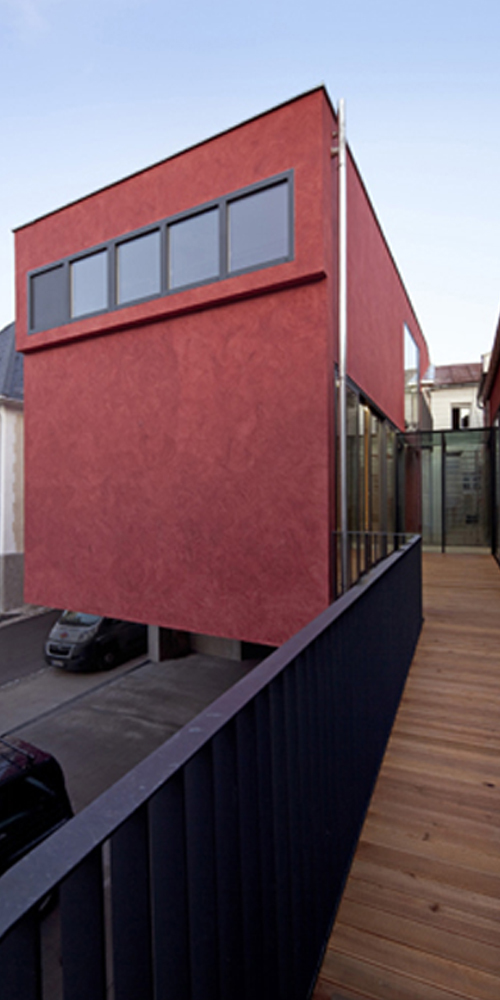 Den Übergang von diesem Grünraum zu dem repräsentativ wirkenden Bereich des Platzes zwischen Amt und Kirche markiert ein einprägsames Bauwerk: ein konstruktiv von Werkraum Wien entwickelter Winkel aus Stahlbeton kragt über zwölf Meter von Norden nach Süden aus und beschirmt eine Grundrissfläche von etwa 80 Quadratmetern. Seine aus dem Boden aufsteigende Wand zieht die Grenze zwischen Platz und Gehsteig. Sie ist an beiden Seiten unterschiedlich, an der Innenseite des Winkels nach Maßgabe der daran befestigten Sitzbank geneigt.