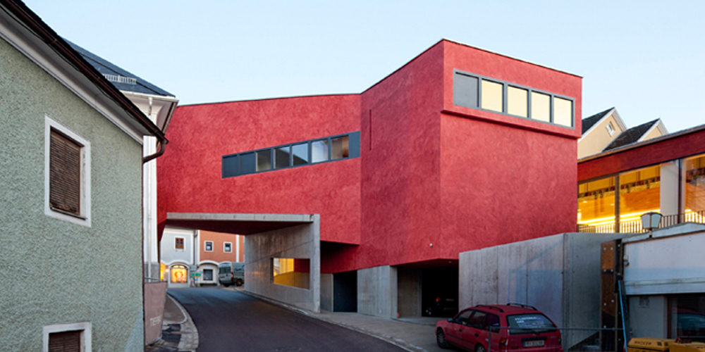 Hier ein traditioneller Ort mit Kirche, Gemeindeamt, Gasthof – und einer neuen Mitte als Besonderheit. Da ein Stationsgebäude – das an Gebirge und Felsen erinnert. Zum Charakter von Beton: zweimal Besuch in Oberösterreich.