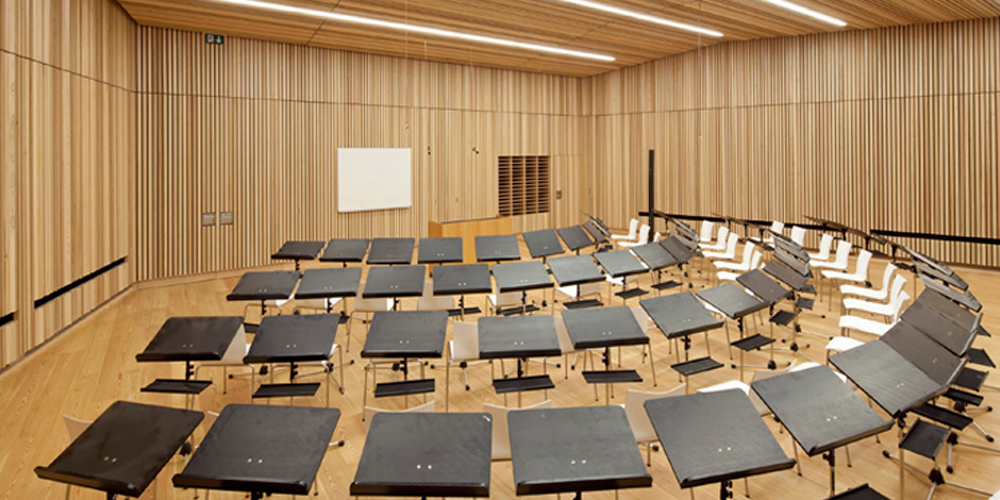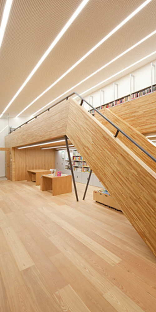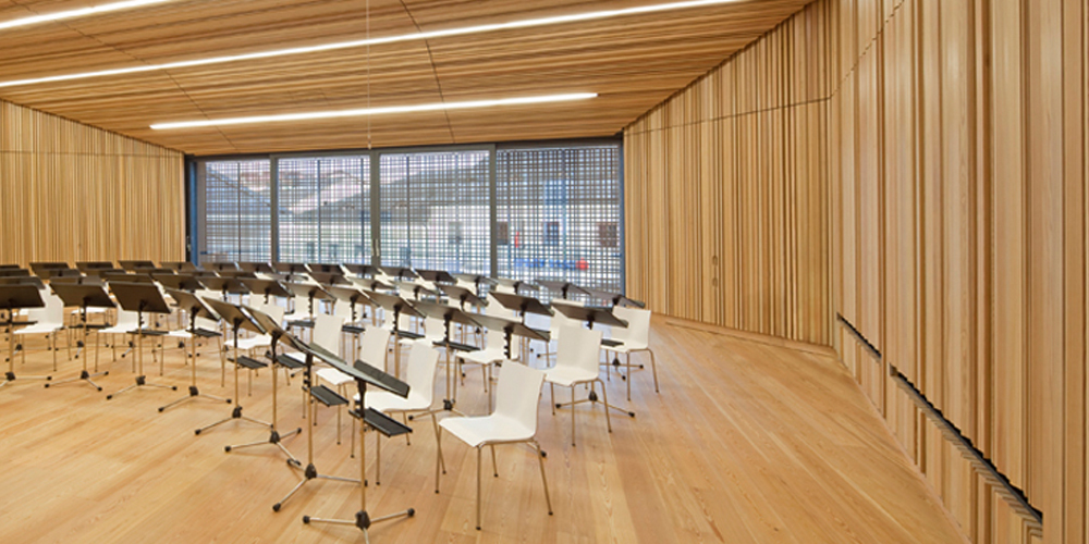 An der Mauer zum Friedhof nimmt eine weitere Bank dieses Motiv auf. Der an seiner schlanksten Stelle nur 15 Zentimeter starke Winkel ist ohne jeden Kompromiss aus Stahlbeton gefertigt. Wasserdicht sowie gegenüber Frost und Tausalz beständig, verbirgt er hinter seinen leicht überhöhten Kanten die Entwässerung des Daches, die ohne Folien und Verblechungen einzig durch die Ausbildung eines leichten Gefälles über zwei in der Wand geführte Abfallrohre funktioniert. An der Untersicht des Daches sind LED-Leuchten in das sorgfältig geplante Fugenbild derSchalung integriert. Dieübrige Platzbeleuchtungbeschränkt sich auf eine indirekte, an den Fuß der begrenzenden Wände und Bänke gekoppelte Lichtführung.