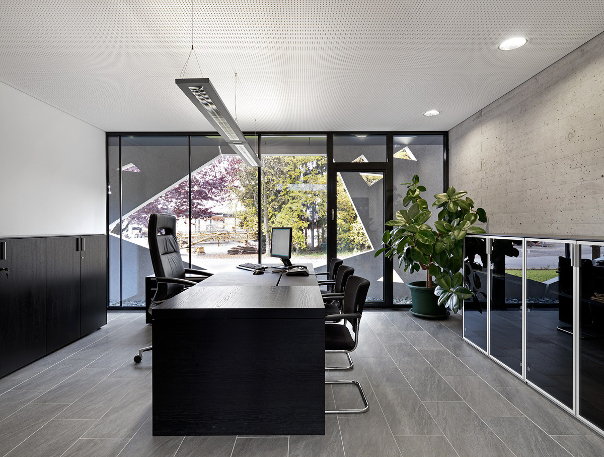 So ist z.B. das Auge das Polygon im Bereich des Fuhrparkbüros – das Auge überblickt den Fuhrpark und das gesamte Werksgelände. Der Eingang wird von einem dynamischen, lang gezogenen Polygon geformt. Dieses Polygon leitet den Betrachter schon beim Vorbeifahren in das Gebäude und schafft eine klare Orientierungs-situation. Das Polygon im Bereich der Geschäftsleitung ist ein stehendes, in sich ruhendes Vieleck, das Stabilität und Ruhe ausstrahlt.