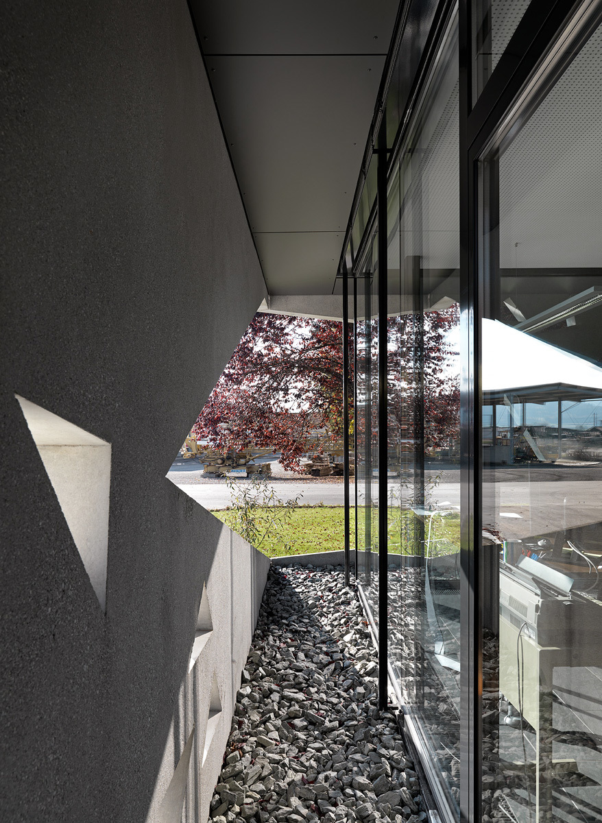 Die „zweite Haut“ des Gebäudes übernimmt mehrere Funktionen. Sie dient als Sonnen- und Sichtschutz, ihre Materialität stellt das rohe Ursprungsmaterial Beton in den Vordergrund, der Hintergrund wird zum Vordergrund.