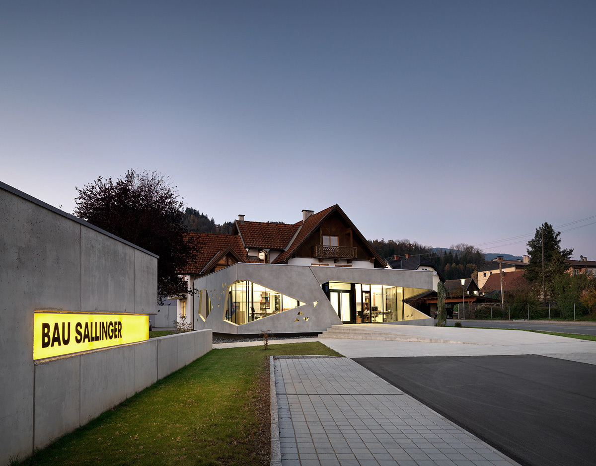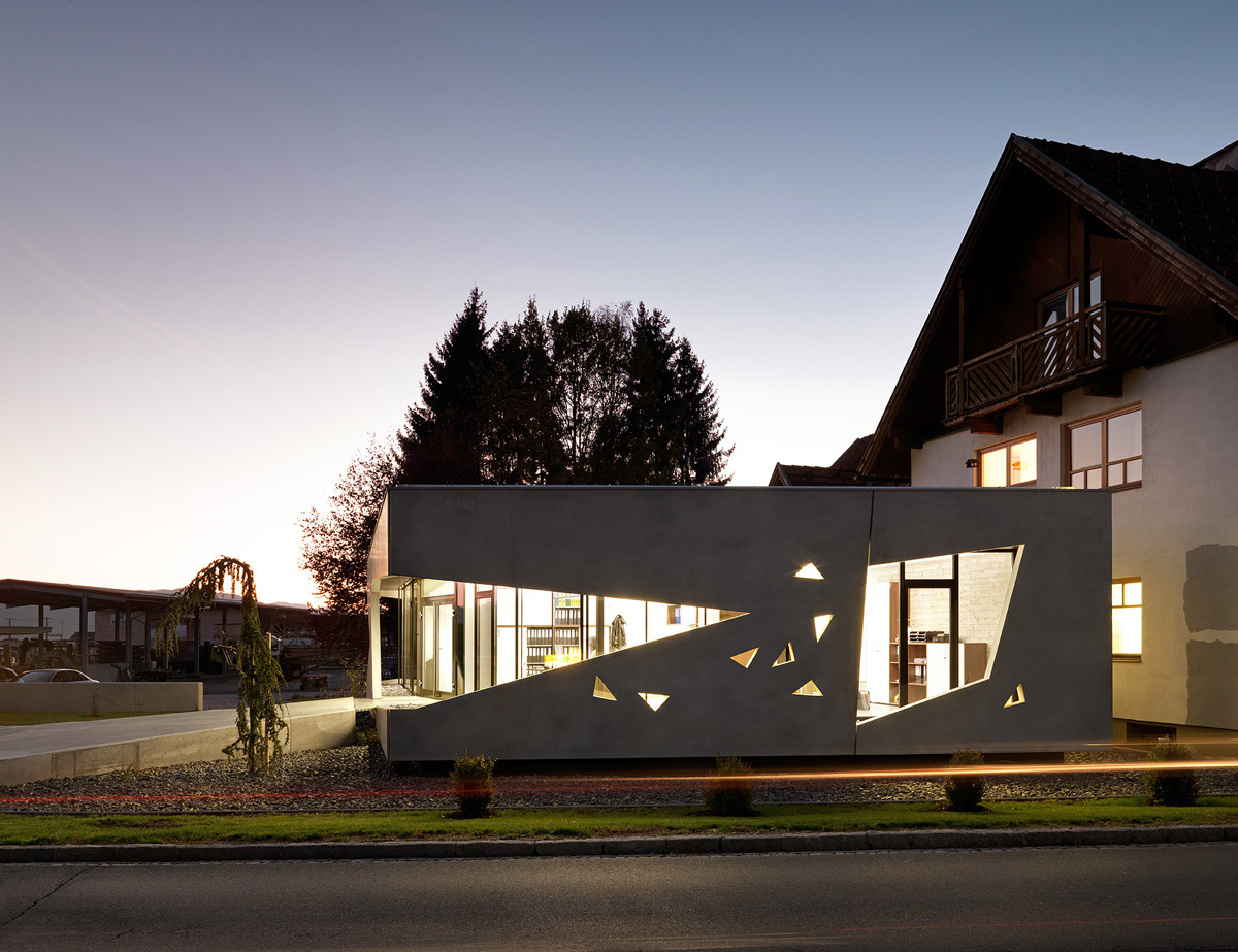 Der Zubau soll aus architektonischer Sicht als klar ablesbarer Entwicklungsschritt in der Firmengeschichte ausformuliert werden. Alt und neu werden miteinander verflochten und der Bestand wird maßstäblich weiterentwickelt. Der Zubau ist ein eingeschossiges Bürogebäude, das im Süden an das Bestandsgebäude angedockt wird. Die klare einfache Form nimmt die Erdgeschosshöhe des Bestandes auf und schwebt über dem umgebenden Niveau. Der neue Baukörper wird zusätzlich durch die Baufluchtlinien beeinflusst und passt sich dadurch in den umgebenden städtebaulichen Kontext ein.