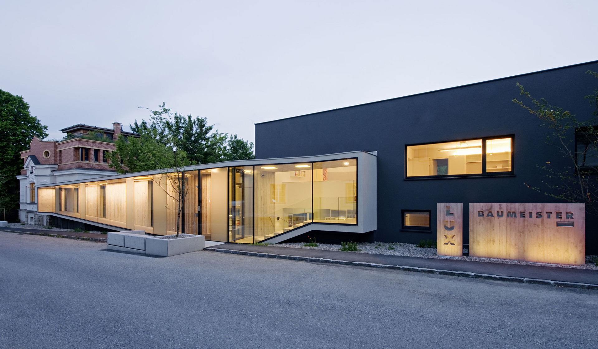 Mit dem neuen Verbindungsgang werden zwei bis dahin getrennt genutzte Gebäude durch einen Eingang begehbar und zwei Arbeitsbereiche der Baufirma Lux miteinander verbunden. Die Gründerzeitvilla sowie das Eckgebäude aus den 1930/31er Jahren bleiben als Einzelteile klar erkennbar. Die energetische Verbesserung der Gebäude und Adaptierung der Innenräume nimmt Rücksicht auf die Eigenschaften und Besonderheiten des jeweiligen Gebäudes und wirken beispielhaft für den baulichen Umgang mit bestehenden Strukturen, auch für künftige Kunden des Bauunternehmens.Der neue Gang ermöglicht, zwei bis dahin getrennt genutzte Gebäude durch einen neuen Eingang zu begehen, die beiden Arbeitsbereiche miteinander zu verbinden und den Niveauunterschied der ansteigenden Gasse zu überwinden. Verbunden wurden damit auch die zu unterschiedlichen Zeiten erbauten Gebäuden zu einem neuen Ganzen, wobei jedoch die Einzelteile in ihrem Charakter klar erkennbar sind.