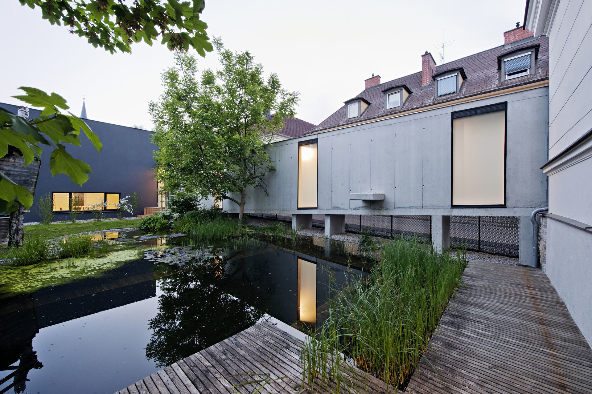 Ergänzt wird das Gesamtkonzept mit einer Außenraumgestaltung, die Gebäude und Parkplatz möglichst harmonisch in das Ortsgefüge eingliedern soll. Es wurden schwerpunktmäßig regional typische, standort-angepasste Pflanzen für die Gestaltung gewählt, damit der spätere Pflegeaufwand nahezu wegfällt. Der Parkplatz, mit Obstbäumen beschattet, wird mit Schotterrasen befestigt – die versiegelte Fläche rund um die Gebäude ist dadurch auf Null reduziert. Der Übergang von den Gebäuden zum öffentlichen Gut (Gehsteig) gelingt mit einer Kiesfläche, die durch die punktuelle Bepflanzung mit Bäumen und Ruderalstauden akzentuiert wird. Der Straßenraum wird dadurch optisch erweitert. Die Situierung der Bepflanzung unterstreicht den Charakter der Gebäude und gibt ihnen einen „grünen Rahmen“.