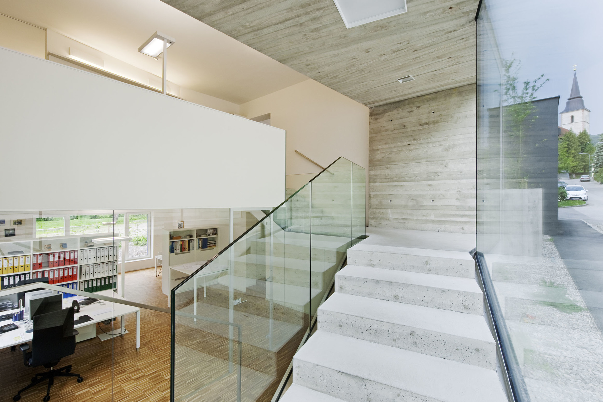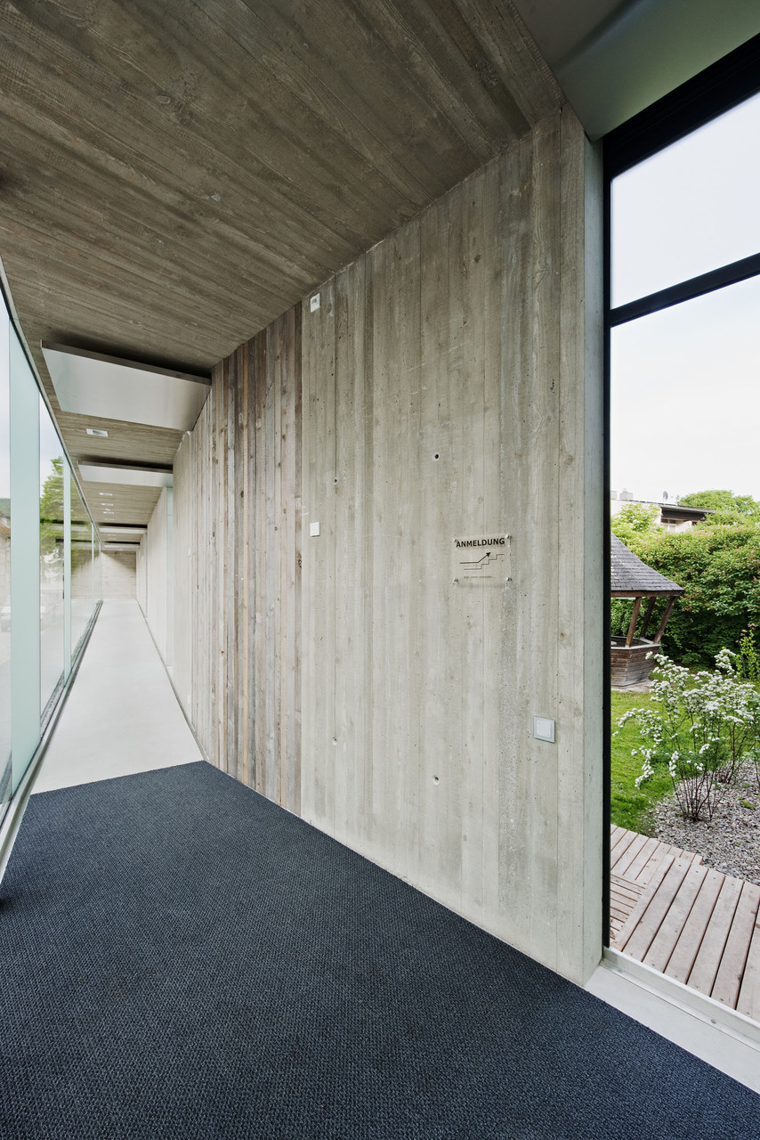 Bei der Wahl der Raumaufteilung, Materialien und Details sollte nicht nur der Mut zur Offenheit, Transparenz und klaren Lösungen, sondern auch die handwerkliche Qualität der Firma Luxbau gezeigt werden. Neben „versteckten“ Speziallösungen wie dem Einbau einer neuen Decke in bestehendes Mauerwerk ist hier die Außenhaut des Ganges aus Sichtbeton zu erwähnen: unterschiedlich breite Bretter wurden hier als Schalung für die Innenseite der Wände und Untersicht der Decke gewählt, die Außenseiten wurden mit großen glatten Tafeln geschalt, Fugen und Richtung der Schalung wurde aufeinander abgestimmt und folgen den Richtungswechseln des Ganges. Der Gangraum gleicht so mehr einer organischen Skulptur als einem bloßen Nutzraum.
