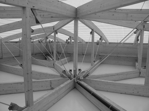 Witterungsschutz bietet ein großes, quadratisches Dach mit ca. 22 m Seitenlänge, das von vier Stahlsäulen getragen wird. Seine Kissenform wird von gekrümmten Holzfachwerksbinder gebildetet, über die oben und unten eine transluzente Membran gespannt ist. Bei Sonnenschein und abends, wenn das Dach von innen heraus leuchtet, macht die Schattenbildung die Holzkonstruktion spürbar. (Text: Architekten)