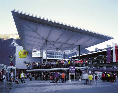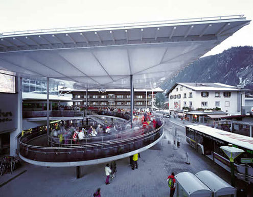Die über einen Architekturwettbewerb gefundene Lösung besteht in einer kreisförmigen Spiralrampe, die mit einer Steigung von ca. 7% bequem vom Straßenniveau hinauf zum ca. 4 m höher gelegenen Zugstiegsbereich der Bahn führt. Gleichzeitig wurde der Wartebereich für die Wintersportler erheblich vergrößert. Der bestehende Platz wurde, ebenfalls in 7% Neigung, nach unten erweitert und mündet in eine kreisförmige Bühne im Innenbereich der Rampe. Die Spiralrampe wird somit auch zum Zuschauerbereich für die als Veranstaltungsarena verwendbare Anlage. Entlang der ansteigenden Rampe sind Glasgeländer montiert, auf denen der Künstler Maurizio Bonato die Bewegung der Skifahrer und Berggeher thematisiert.
