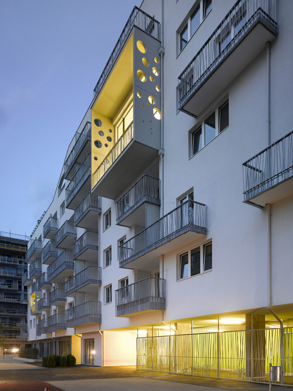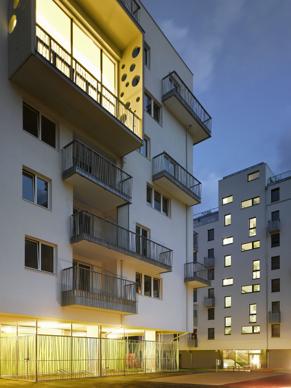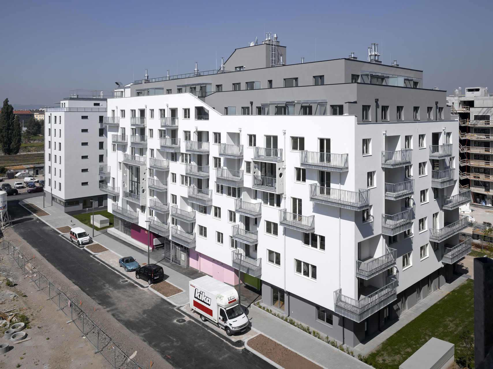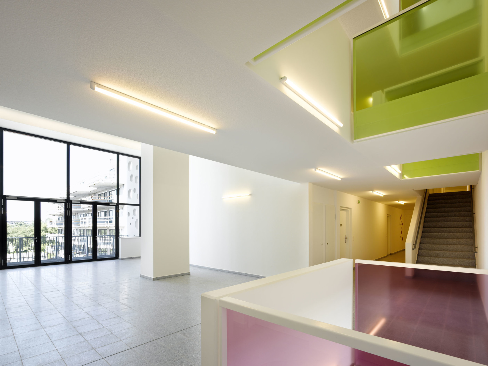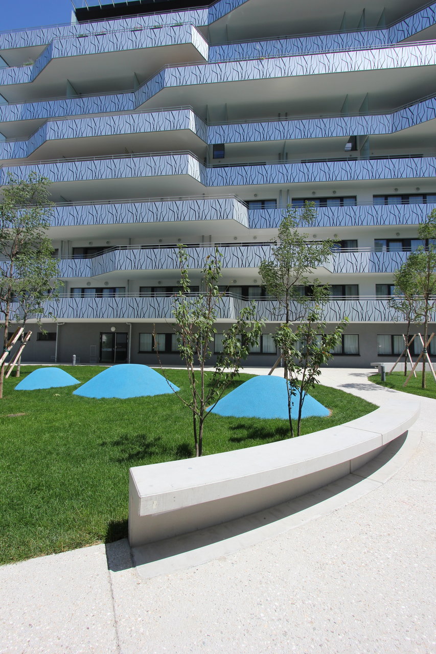 Jede Wohnung ist mit einem wohnungsbezogenen Freiraum ausgestattet. Die Architekten wählten für die Loggien einen annähernd quadratischen Grundriss, der trotz kleiner Loggiaflächen ein geselliges Beisammensein ermöglicht. Die kompakten Wohneinheiten werden durch ein Angebot an differenzierten, unterschiedlich bespielbaren Freiräumen ergänzt. Auch innerhalb des Gebäudes befinden sich Freiflächen: „schwebende Gärten“ in Form verglaster Gemeinschaftsbereiche in den Geschossen. Sie dienen als Treffpunkt, Raum für Veranstaltungen oder Chill Out Area, hauptsächlich aber als Belichtung der Erschließungszone. Diese über die Fassade verteilten „schwebenden Gärten“ verleihen dem Haus, das sich in einer formal strengen Umgebung befindet, ein freundlich anmutendes Erscheinungsbild. Ein weiterer Freiraum befindet sich auf dem Dach, das barrierefrei über den Lift erreicht wird. Von hier bietet sich für die folgenden Jahre eine sich stetig wandelnde Aussicht über das Areal.