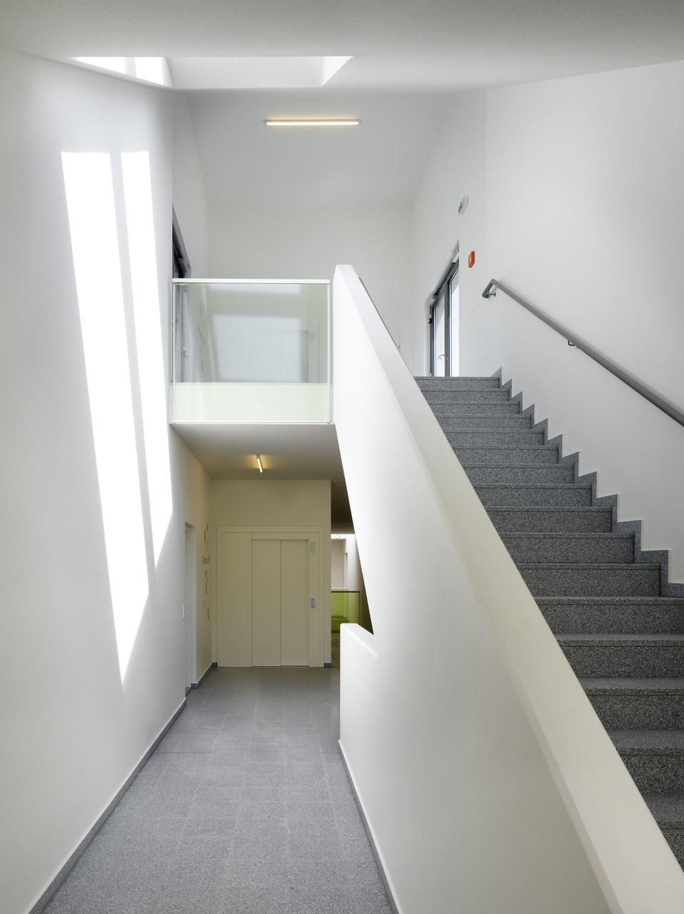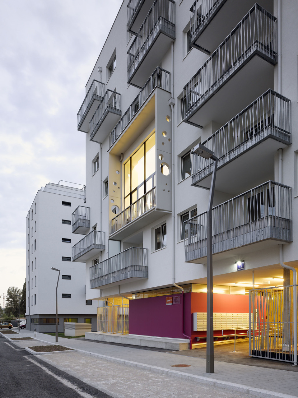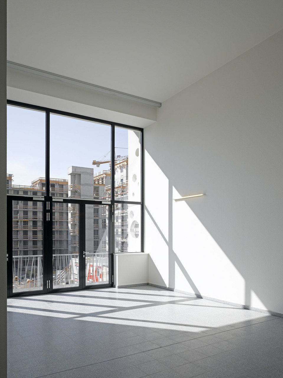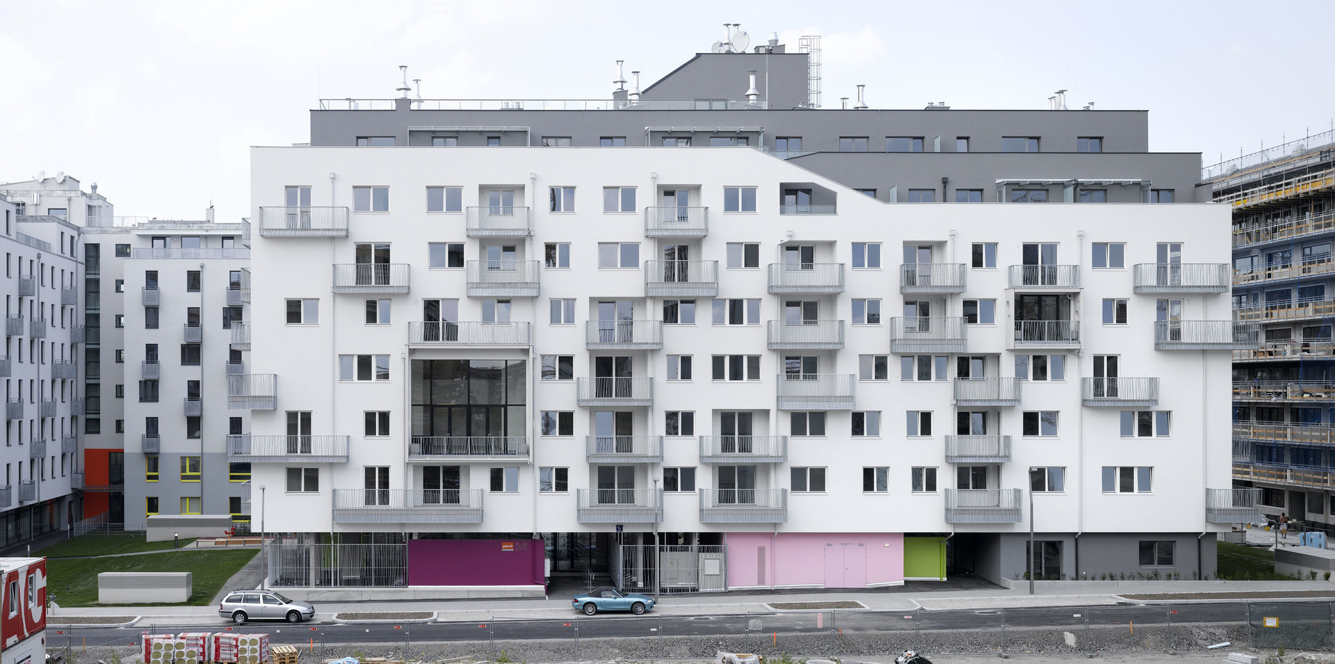 Jede Wohnung ist mit einem wohnungsbezogenen Freiraum ausgestattet. Die Architekten wählten für die Loggien einen annähernd quadratischen Grundriss, der trotz kleiner Loggiaflächen ein geselliges Beisammensein ermöglicht. Die kompakten Wohneinheiten werden durch ein Angebot an differenzierten, unterschiedlich bespielbaren Freiräumen ergänzt. Auch innerhalb des Gebäudes befinden sich Freiflächen: „schwebende Gärten“ in Form verglaster Gemeinschaftsbereiche in den Geschossen. Sie dienen als Treffpunkt, Raum für Veranstaltungen oder Chill Out Area, hauptsächlich aber als Belichtung der Erschließungszone. Diese über die Fassade verteilten „schwebenden Gärten“ verleihen dem Haus, das sich in einer formal strengen Umgebung befindet, ein freundlich anmutendes Erscheinungsbild. Ein weiterer Freiraum befindet sich auf dem Dach, das barrierefrei über den Lift erreicht wird. Von hier bietet sich für die folgenden Jahre eine sich stetig wandelnde Aussicht über das Areal.