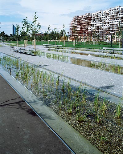 Rund um das Gebäude wurde ein „versunkener Garten“ als Freiraum geplant: ein höhenmäßig mit Sitzstufen leicht abgesetzter Bereich im Freien als bauplatzübergreifendes Thema des Quartiers. Das Sujet der „versunkenen Gärten“ war in den Wettbewerbsentwürfen bei allen Bauplätzen noch klar ablesbar. In den Renderings gedieh üppige Vegetation in Gräben und Vertiefungen rund um alle Gebäude und entlang der Vorgartenstraße. In der Umsetzung gebieten Tiefgaragen und notwendige Entwässerungen diesem Konzept Einhalt. Am Bauplatz von synn architekten sind die versunkenen Gärten nach erfolgter Umsetzung - zumindest in Spuren – noch ablesbar. (Text Architekten, redaktionell überarbeitet und erweitert Martina Frühwirth)