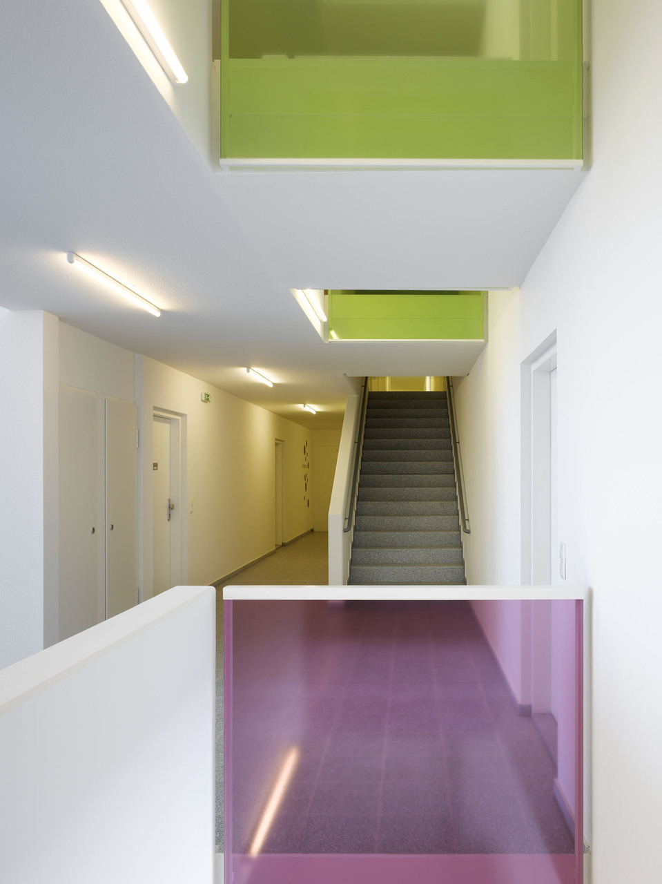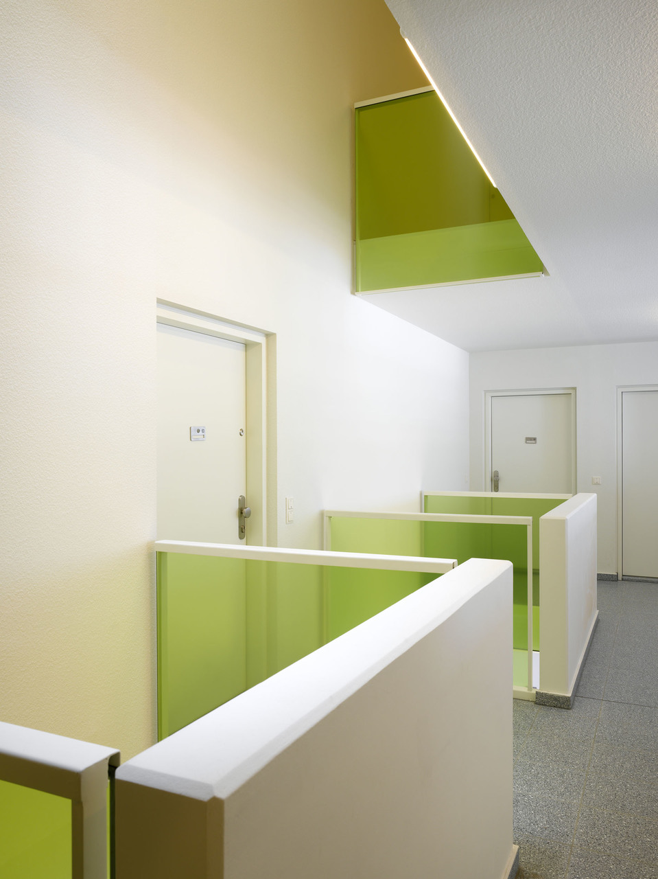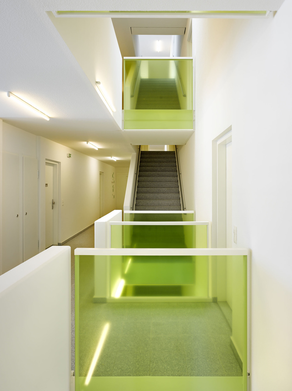 In den Minilofts stellt die fixe Sanitärbox die einzige wirklich notwendige Raumtrennung dar. Die größeren Wohneinheiten, die als Ein- oder Zweiraumwohnungen geplanten Familienwohnungen sind durch einen Funktionsblock (WC, Bad) gegliedert, um den sich gleichwertige Räume anordnen. Diese Räume können je nach Bedarf zusammengelegt (Schrank, Vorhang, Leichtbauwand) werden und verwandeln sich so in Zwei- bzw. Dreizimmerwohnungen.