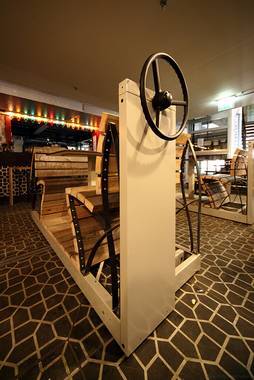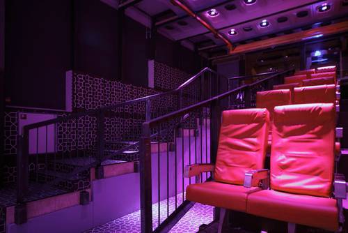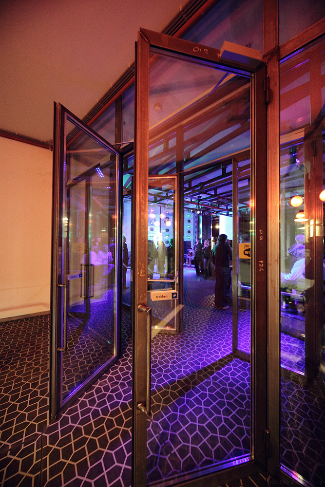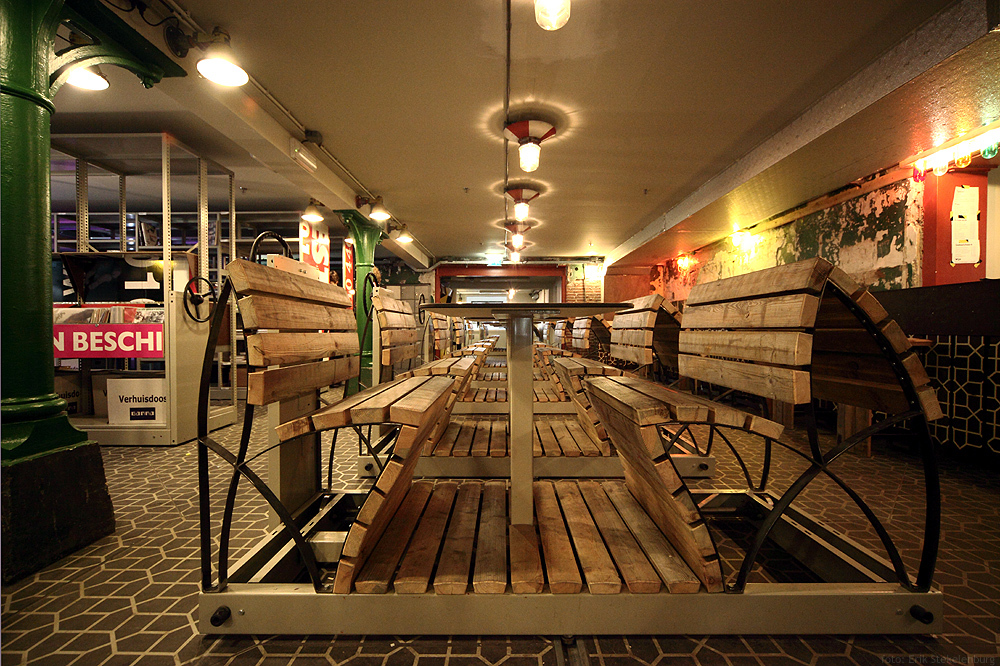 The house, the bar and the filmstudios have been fitted into the existing smaller spaces of the basement. Here, the atmosphere is determined by the present functional tiles and installation technology. By applying a series of toilets, made out of liquid containers (Marc Heumer) and oak wood furniture (Jasper van der Made), it completes an alienated postindustrial atmosphere. In the shop and foyer the rolling archive cabinets have been reused, as they were previously owned by the Photo Museum and found in the cellar. For the LP, CD, DVD, Superuse shop and the lockers this system has been applied by which the space is utilised efficiently in it's original function. The part in front of the bar there are ten of these frames with four persons seats, composed more spaciously. As soon as clients discover that their seats are mobile, this creates different kinds of social encounter.