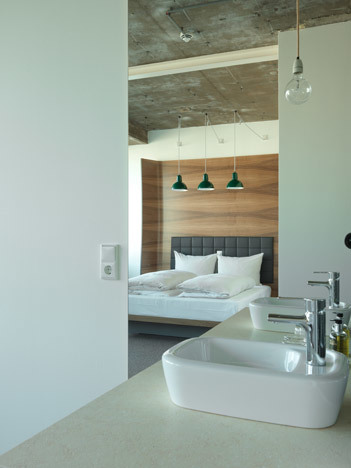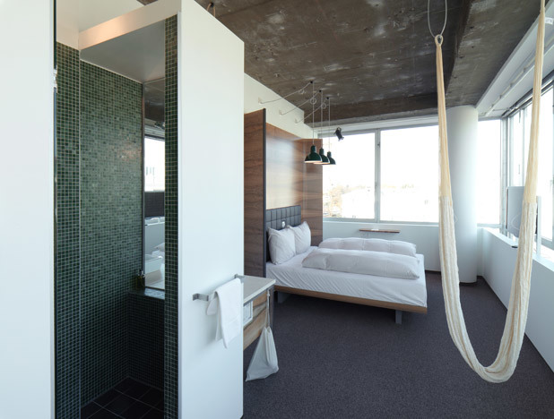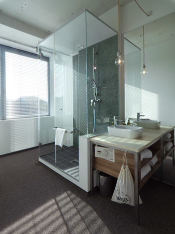 Die (Doppel)Zimmer sind ein Kapitel für sich. Sie bewegen sich in der Größenordnung von 16 (Standard) bis 26 Quadratmetern (Eckzimmer, eine Suite) und sind so knapp bemessen, dass der Architekt kleine Nischen einführen musste, um das Doppelbett unterzubringen und am Fußende doch noch vorbeigehen zu können. Das Ganze funktioniert wie ein Reißverschluss. Die Nischen sind verschränkt: Im einen Zimmer ist dieses Doppelbett nahe am Fenster, im anschließenden nahe an der Tür. Mit den Duschkabinen verhält es sich umgekehrt: Einmal sind sie ganz nah am Fenster (geschützt durch ein Rolleau), im anderen Fall nahe dem Eingang. In jedem Fall sind sie aber, im Verhältnis zum Minimalismus der Zimmer, sehr angenehm dimensioniert.
