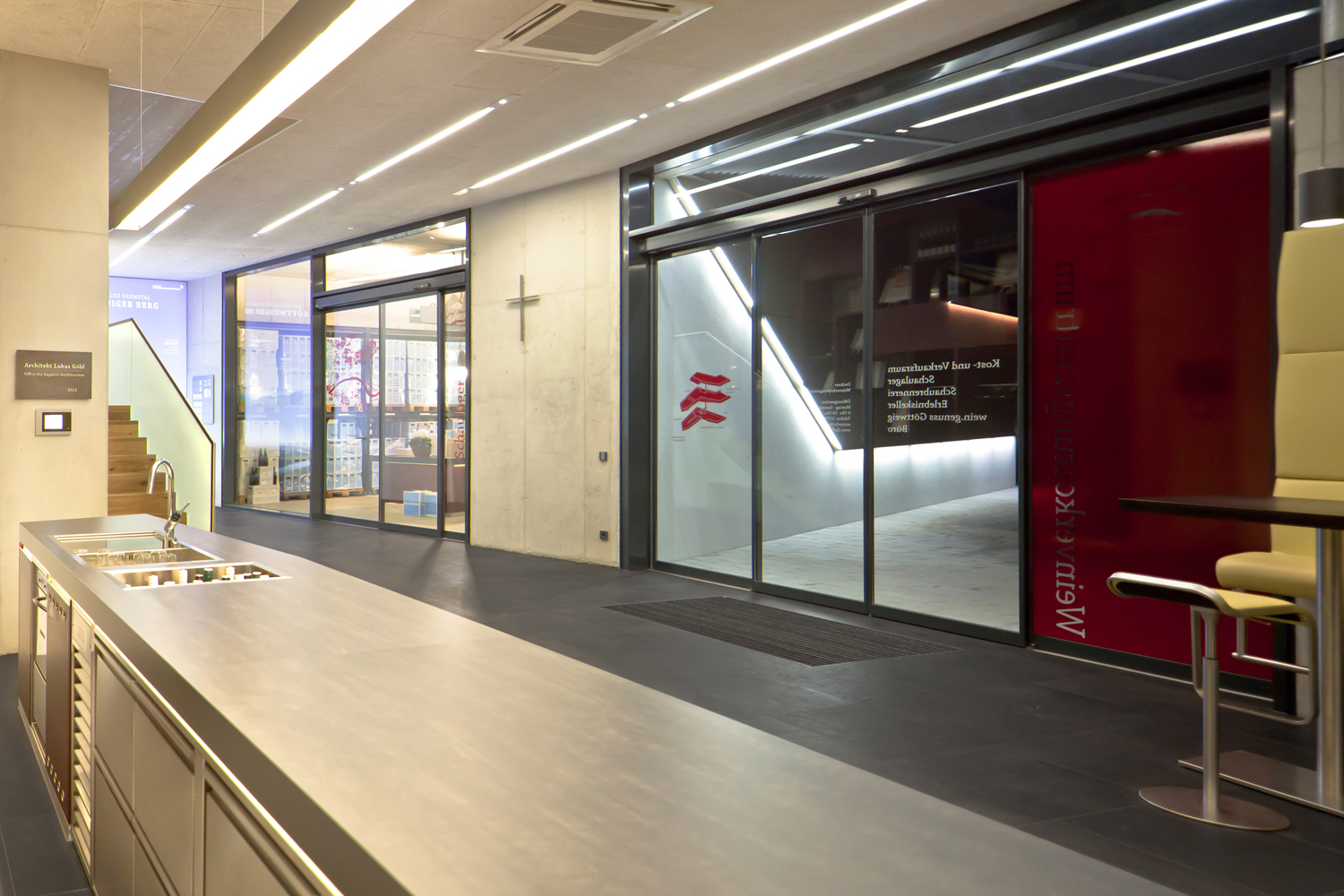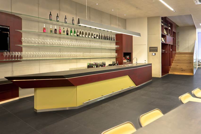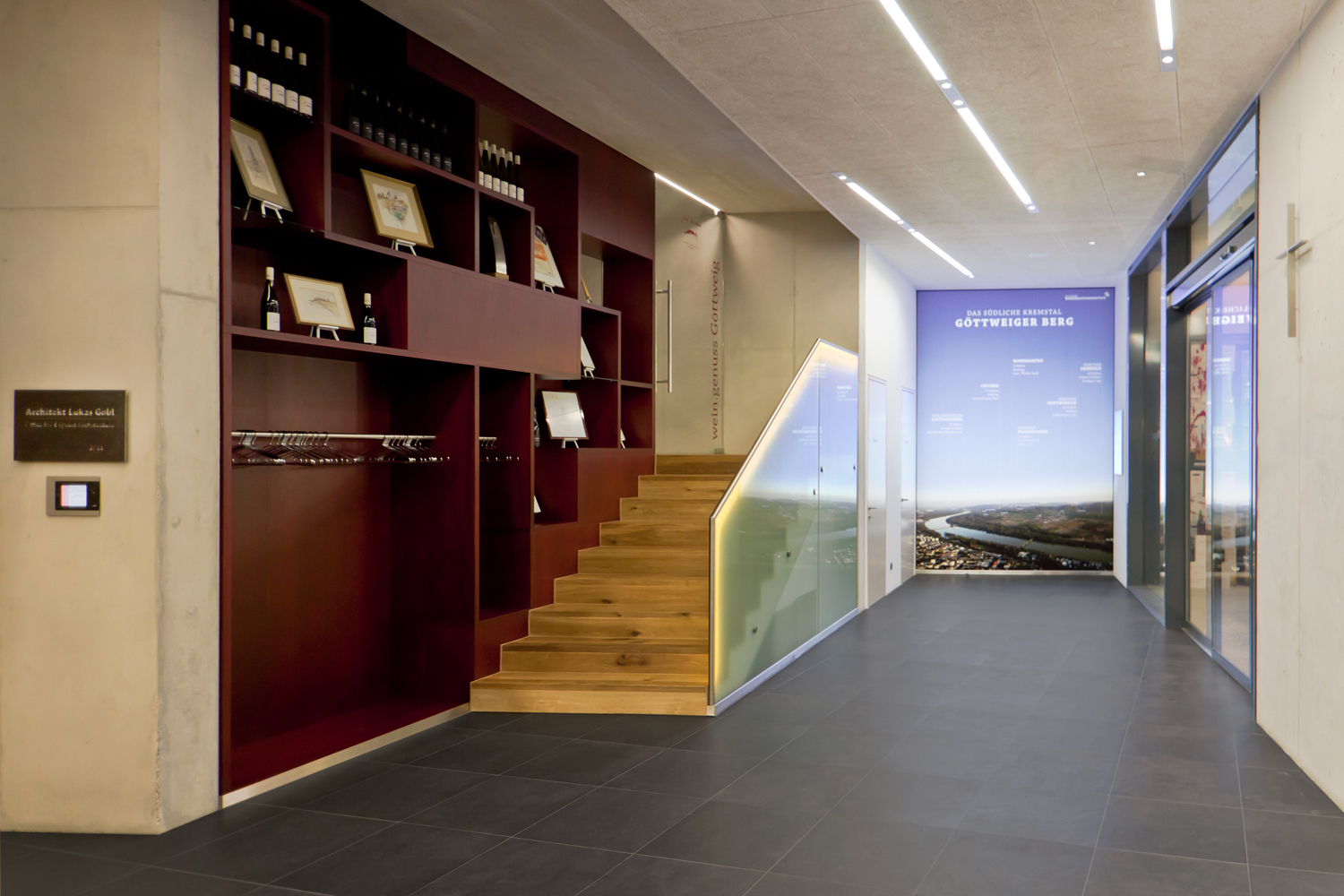 Im Fokus des Projekts steht die Vermarktung und Präsentation des hauseigenen Weins. Im Erdgeschoß sind die Verkostungs-, Verkaufs- und Präsentationsbereiche untergebracht. Beim Eintreten fällt sofort die zentral positionierte Bar in den Blick; der dahinterliegende Präsentationskasten offeriert die aktuellen Angebote. Ein bedruckter Raumteiler aus Glas grenzt den integrierten Büro- vom Konsumationsbereich ab, erlaubt jedoch auch wechselseitige Durchblicke. Durch die im Schauraum gelagerten Bestände entsteht eine charismatische Weinkelleratmosphäre. Ein großes Schaufenster an der Rückwand gibt Einblicke in die neu eingerichtete Schaubrennerei, darüber hinaus befindet sich dort ein Durchgang, der in die „Unterwelt“ des großen Weinkellerareals führt.