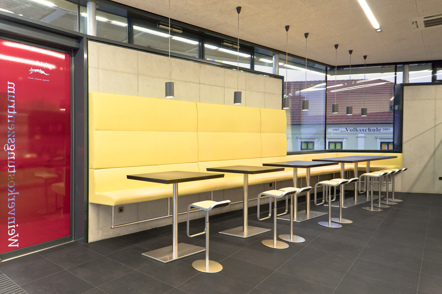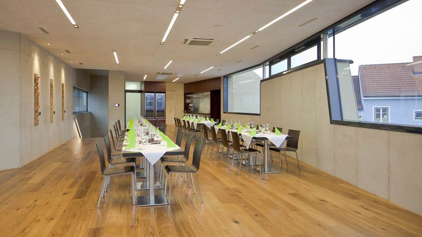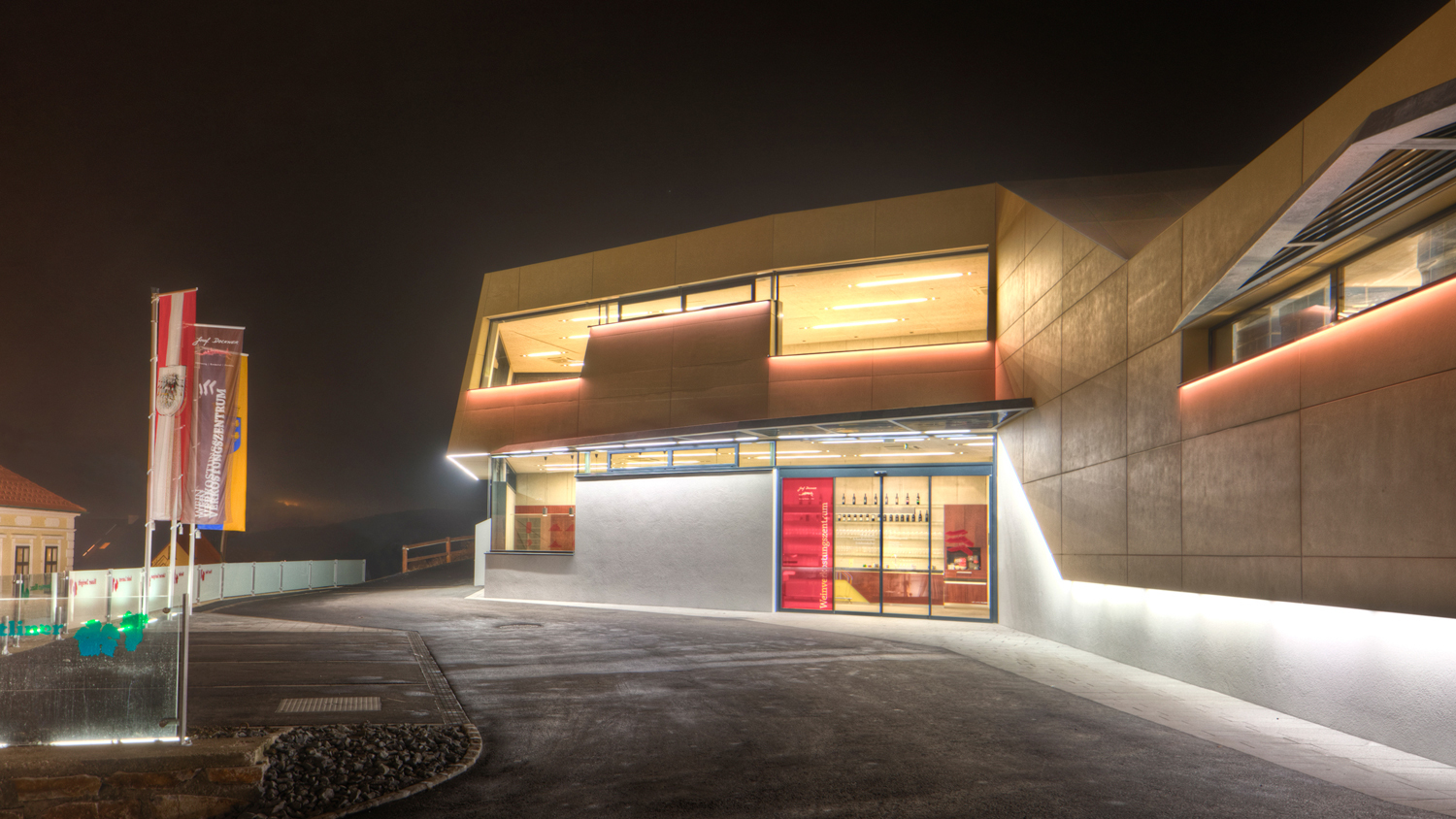 Für Veranstaltungen verschiedenster Art stehen die Räumlichkeiten im Obergeschoß zur Verfügung. Hier eröffnet eine raumhohe Glaskonstruktion mit integrierter Schiebetüre einen Panoramaausblick auf das Benediktinerstift Göttweig und die angrenzende Weinlandschaft. Saisonbedingt kann der vom Multifunktionsraum aus zugängliche Garten als zusätzliche Erweiterung des Innenraums genutzt werden. Bordeauxrotes Birkenfurnier, handgehobelter Mooreichenboden, lössfarbenes Leder und anthrazitfarbene Leuchtkörper Innen und Außen betonen die Nähe zur Weinproduktion.