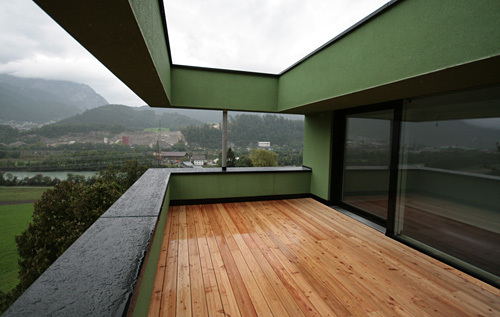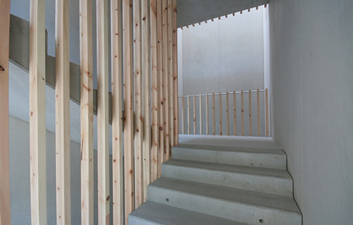 Nachdem die Zimmergeschosse im Bestand umgebaut werden sollen, wurde gleichzeitig direkt hinter der Aufstockung ein neues, in Zukunft als Fluchtweg notwendiges, Treppenhaus errichtet. Der funktionale Erschließungsbau ist komplett in Sichtbeton gefertigt, allein ein Massivholzgeländer aus Zirbenholz zieht sich wie eine Installation über alle Geschosse und weckt über das Geruchserlebnis Assoziationen zur Zirbenstube des Altbestandes. (Text: Claudia Wedekind nach einem Text des Architekten)