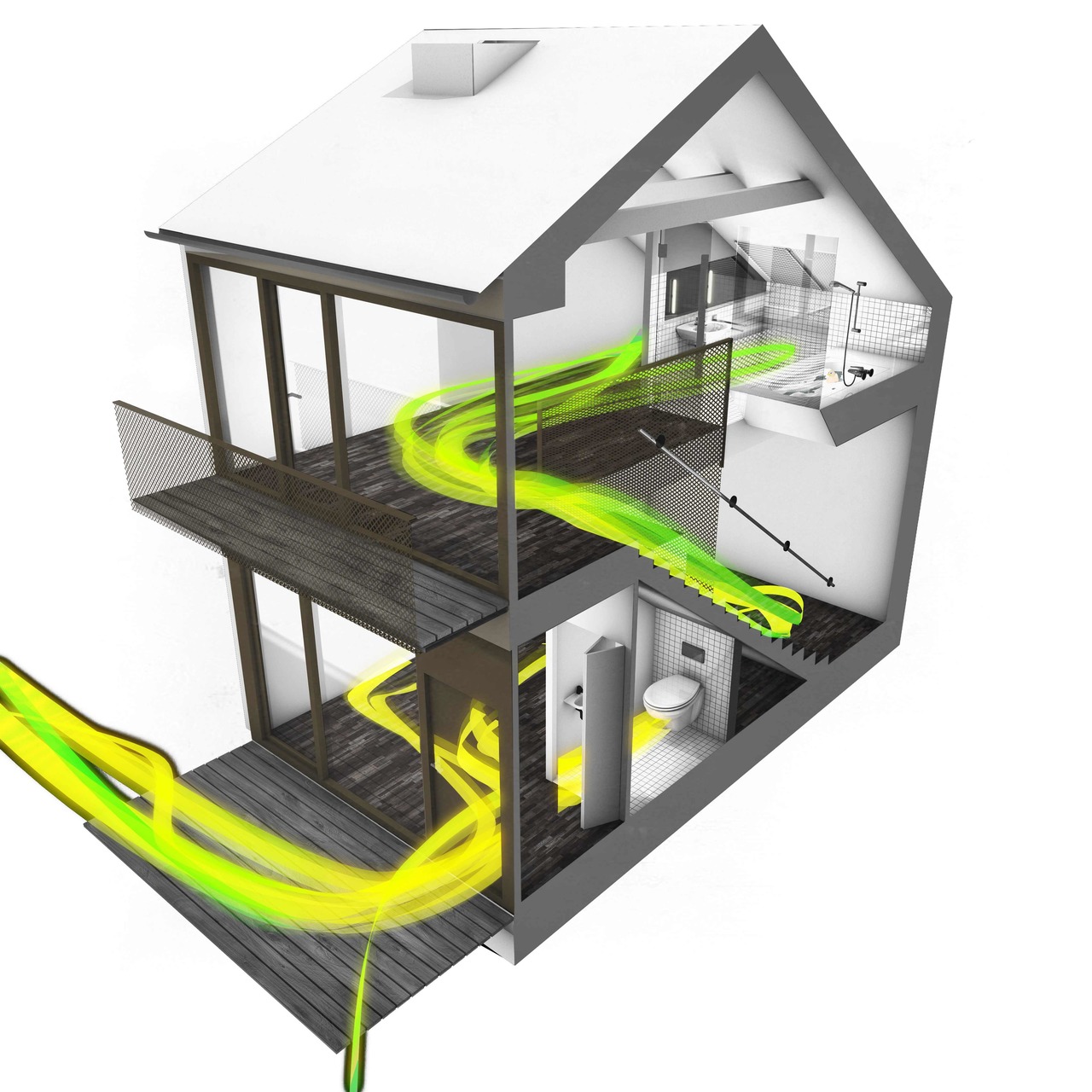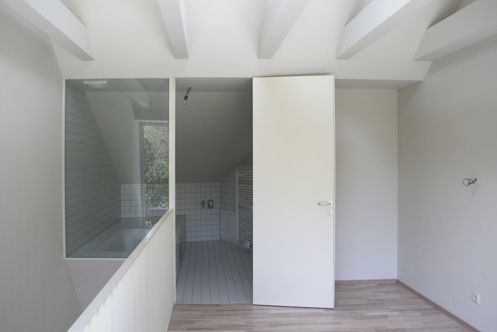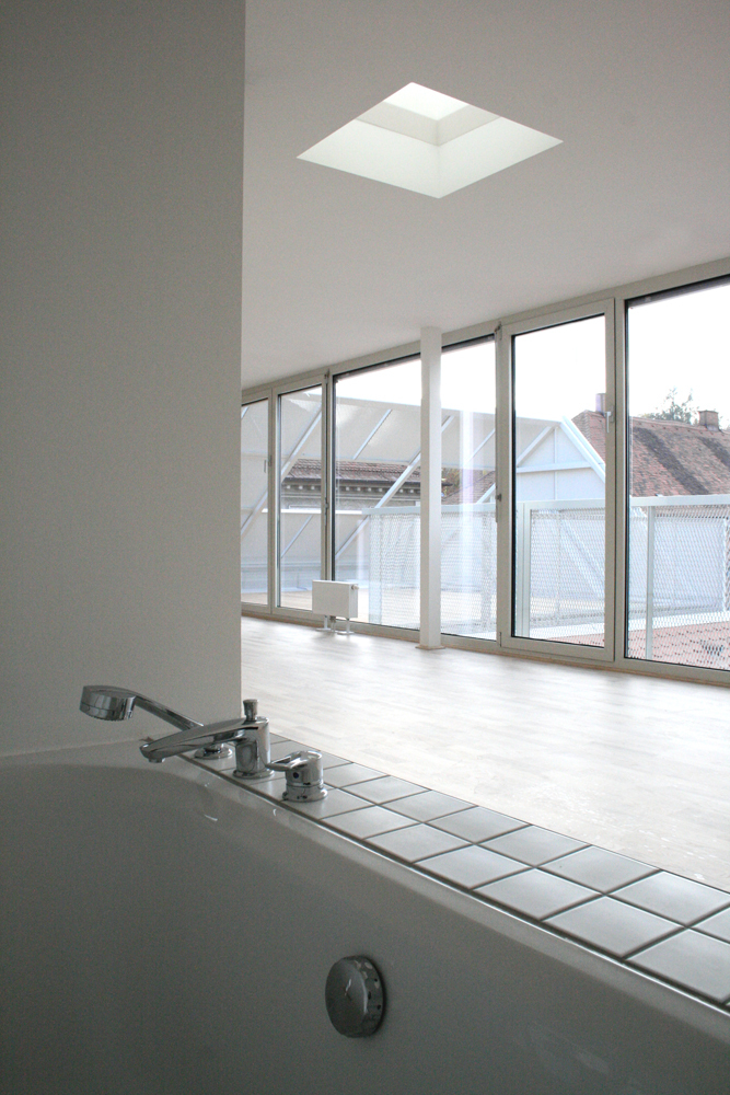 Der Hoftrakt wurde vollständig zum Grünraum geöffnet und bietet besondere Kleinwohnungen - sogenannte „Mini-Lofts“, also zweigeschossiges Wohnen auf 40-50 Quadratmetern mit kommunikativ geöffneten halböffentlichen Bereichen im Erdgeschoss und privaten Rückzugsbereichen im Obergeschoss. Es entsteht ein vertikaler Wohnraum, der trotz des minimalen Flächenangebots ein maximales Raumgefühl vermittelt.