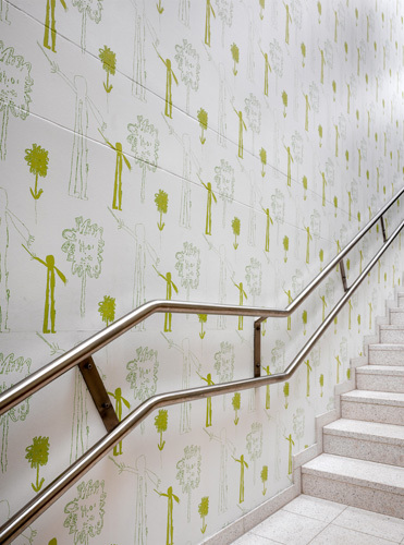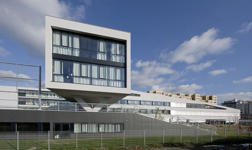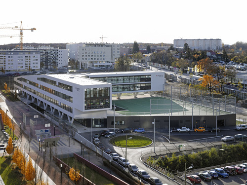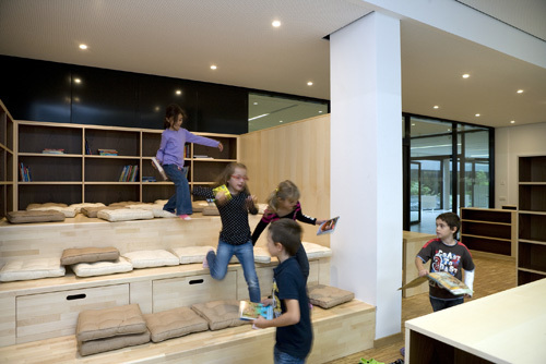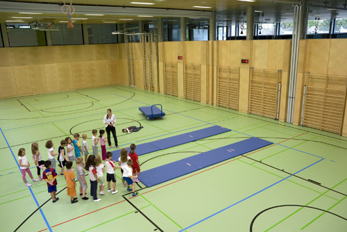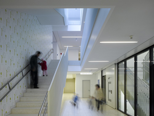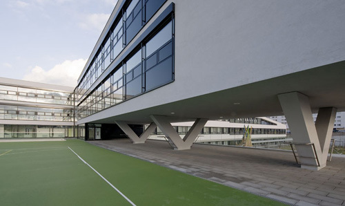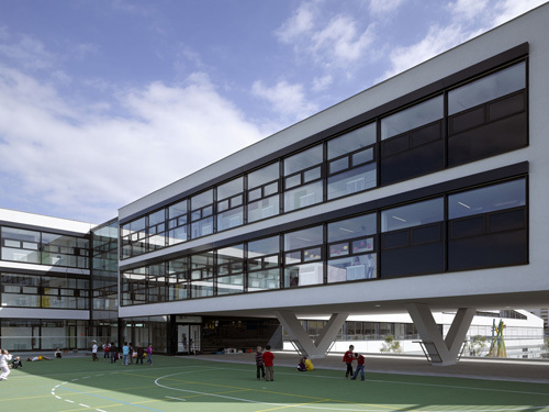 Sämtliche Unterrichtsräume sind vom Sportplatz abgewandt. Die Klassenzimmer sind nach Südosten bzw. Südwesten orientiert, die Sonderunterrichtsräume nach Nordosten. Die Verwaltungsbereiche der beiden Schulen sind im 1.Obergeschoss untergebracht. (Text Architekten, redaktionell überarbeitet Martina Frühwirth)