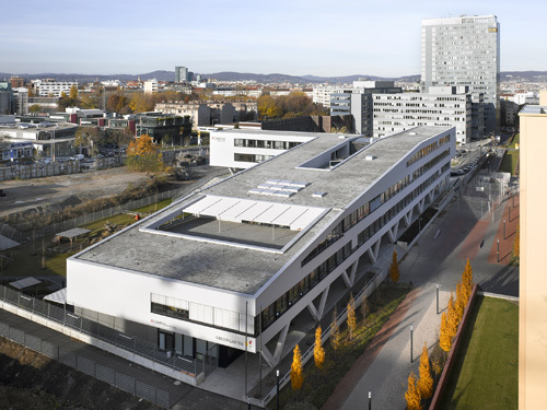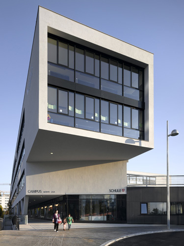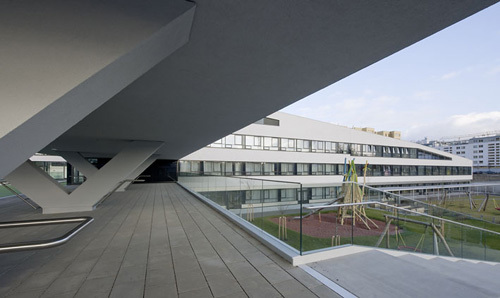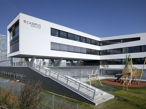 Das erforderliche Ausmaß an Freiflächen (6.500 m²) wird durch Nutzung von Dachflächen geschaffen. Die Freiflächen des Kindergartens und des Horts befinden sich im windgeschützten, abgesenkten Freiraum, die der Volksschule sind teilweise im Garten bzw. auf der Dachterrassenfläche nahe der Unterrichtsräume über dem Kindertagesheim situiert. Diese gemeinsamen Sport- und Freiflächen sowie Speiseräume ermöglichen besondere Synergien zwischen Schule und Kindergarten. Trotz klar abgrenzbarer Bereiche der einzelnen Funktionsgruppen sind variable Nutzungen bei sich änderndem Flächenbedarf der einzelnen Bildungseinrichtungen möglich. So können die Foyers der Turnsäle, die Pausenhalle der Volksschule, die Bibliothek, der Mehrzweckraum und der Speisesaal zusammengelegt werden. So entsteht für alle Campus-Kinder eine Zone des sozialen Austausches.