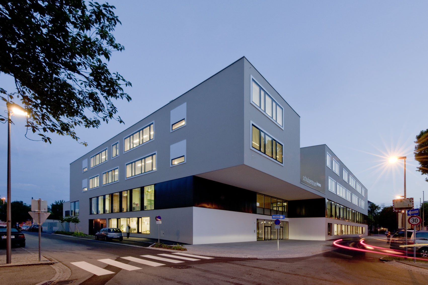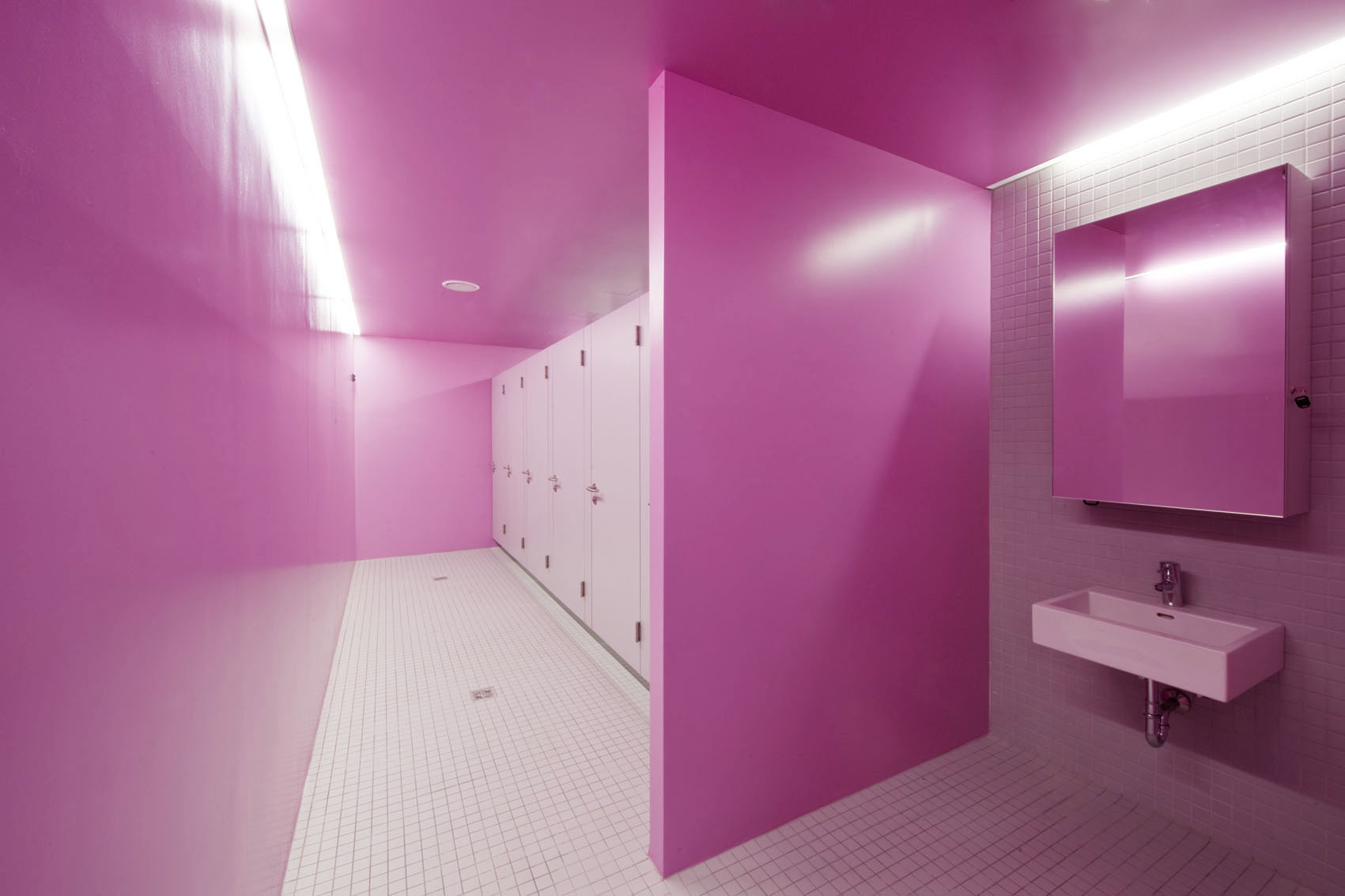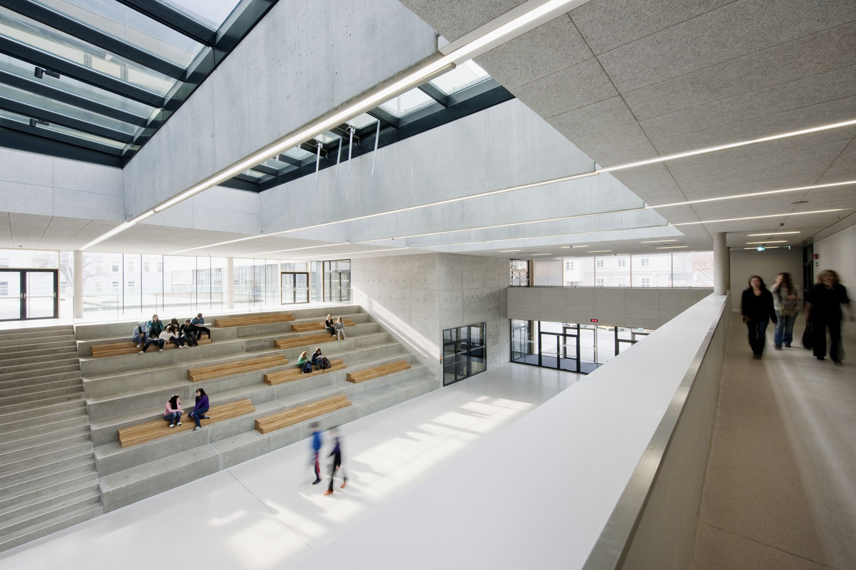 Die Mischung der drei Schultypen, die sich Foyer, Turnhalle und Mehrzweckräume teilen und räumlich zueinander offen und durchlässig sind, war ein Experiment, mit dem die Nutzer heute, ein Jahr nach Inbetriebnahme, sehr zufrieden sind. Dabei wurde konzeptuell und architektonisch auch auf das Miteinander der Schüler gesetzt, zwischen denen Begegnungen und Kontakte gefördert werden sollen. Die Orientierung im Komplex wird erleichtert durch ein grafisches Leitsystem nach einem Konzept von Walter Bohatsch, das die einzelnen Schul- und Nutzungsbereiche nach Farben definiert. In den Treppenhäusern und an den Glastüren sind die grafisch reduzierten Gebäudeaufrisse zu geometrischen Ornamenten gruppiert. Bei den Toiletten leisteten sich die Architekten die augenzwinkernde politische Unkorrektheit, die Mädchen-WCs in Weiß mit Bonbonrosa zu halten – was erwartungegemäß auf Begeisterung seitens der jungen Nutzerinnen stößt.
