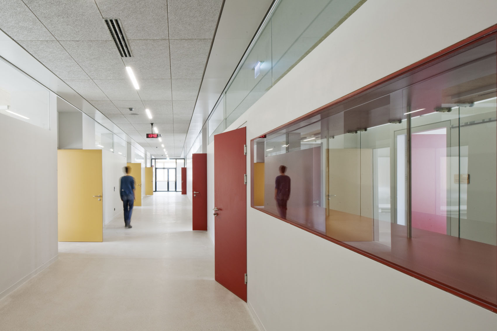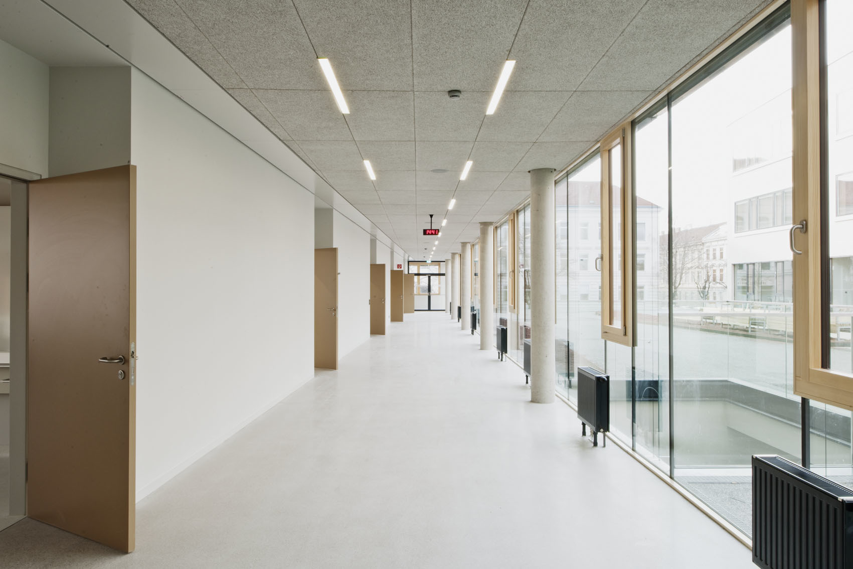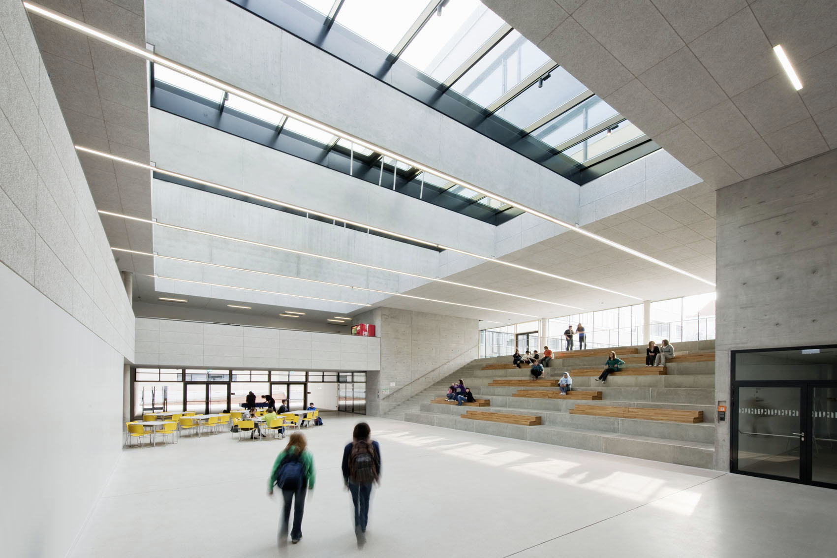In den Klassenzimmern und den Bereichen für das Lehrpersonal herrschen mit Holzoberflächen und naturfarbenen Akustikelementen wärmere Töne vor. Die Architektur bleibt dabei überall im besten Sinne zurückhaltend, sowohl in der einfachen, übersichtlichen Struktur des Gebäudekomplexes wie in der abgetönten Farbigkeit und der schlichten Materialität der Oberflächen mit Sichtbeton für Wände und Decke des Foyers und geschliffenem Estrich für den Fußboden – mit dem bemerkenswerten Effekt einer Unterschreitung der veranschlagten Kosten. Planungs- und Bauprozess verliefen, auch dank der Offenheit der Auftraggeberschaft und der involvierten Schuldirektionen, problemlos. Aufgrund von dreifachverglasten Fenstern mit dunklen Metallrahmen außen und Holzrahmen innen und einer kontrollierten Belüftung in den Klassenräumen hat der Komplex Niedrigenergiestandard. Die durch die kosteneffiziente Planung eingesparten Mittel erlaubten die zusätzliche Anschaffung von Möbeln, die über den Minimalstandard von Schulmöblierungen hinausgehen.