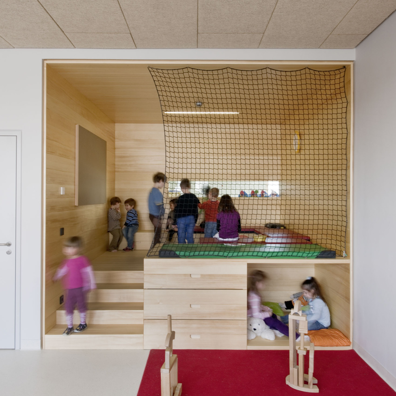 Innen passen sich die Räume mit ihren niedrigen Parapeten den Dimensionen der kleinen Nutzer an. Warme Holztöne schaffen Wohnlichkeit. Hits sind zum einen ein gepolstertes Spiel-Krokodil mit Tunnel, zu dem die Treppe ins Obergeschoß samt dem Raum unter ihr gemacht wurde, und zum anderen die alkovenartigen holzverkleideten Nebenräume, in denen sich Kinder zurückziehen, ja gar verstecken können. Dazu kommen die großen Fenster in Richtung Bahnhof – mit dem Ein- und Ausfahren der Züge als täglich neue Attraktion.