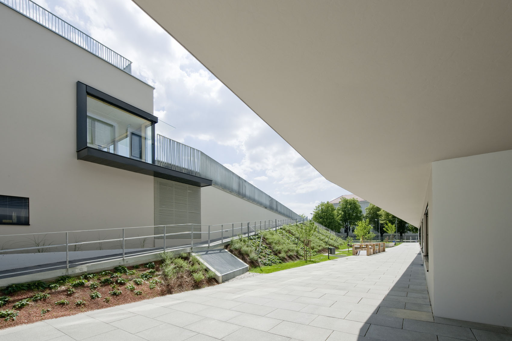 Das durch einen Wettbewerb entstandene Projekt des Wiener Architekturbüros NMPB (Nehrer Medek Pohl Bradić) geht angesichts des beschränkten zur Verfügung stehenden Platzes auf dem innerstädtischen Gelände von einem kompakten quaderförmigen Baukörper aus. Im Schulbereich wurde der Bau außen mit einem grau-beige-farbenen Putz mit leicht unregelmäßiger Oberflächenstruktur versehen. In der erdgeschoßig einspringenden stadtseitigen Ecke des Komplexes liegt der durch die Obergeschoße gedeckte Eingang. Hinter ihm öffnet sich eine zweistöckige Aula mit hellgrauen Sichtbeton-Oberflächen, die auch als Mensa genutzt wird. Tageslicht kommt über die verglaste Decke, über einen erdgeschoßigen überdachten Bereich, der als Freiluftklasse genutzt werden kann, und außerdem vom Pausenhof im Obergeschoß, der auf dem Dach der Turnhalle liegt und von der Aula über eine tribünenartige breite Treppe erreichbar ist. Ein bis auf Erdgeschoßniveau gehender Patio bringt zusätzlich reichlich Tageslicht in alle Bereiche des Gebäudekomplexes. Ein leichter Außenknick der Fassade nach Süden, dem auch die Klassenzimmer folgen, vermeidet durch seine leichte Unregelmäßigkeit eine allzu rigide Orthogonalität des Ganges vor den Klassen, der sich so platzartig zu weiten scheint.