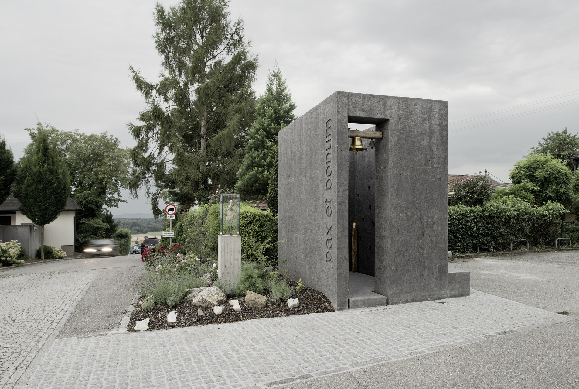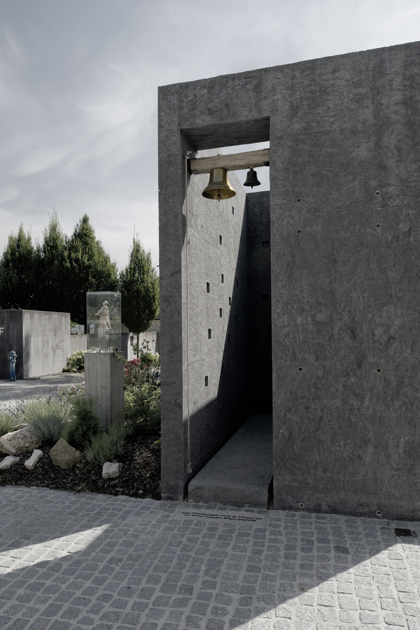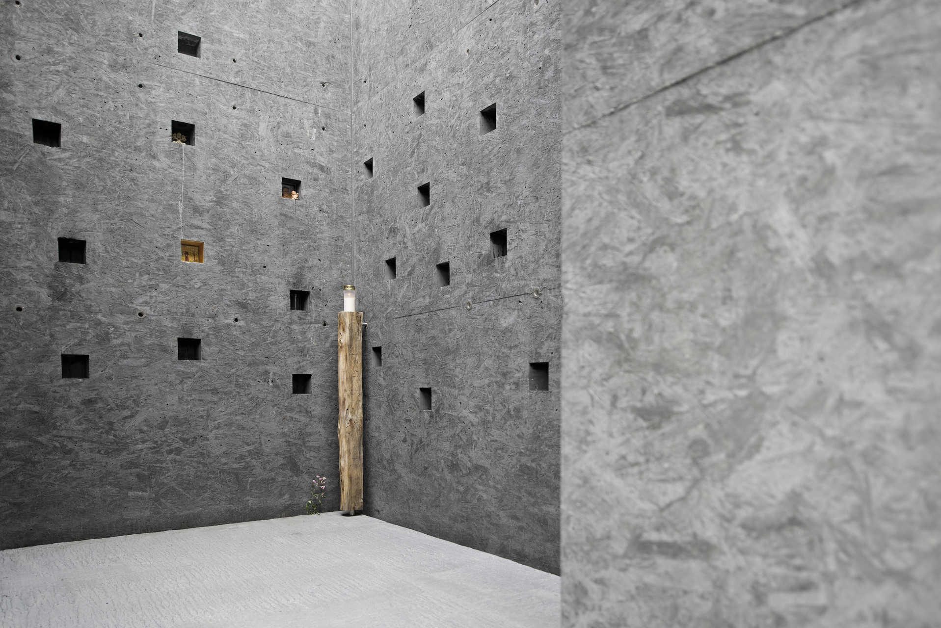 Steht man vor der Kapelle, macht sie einen abgeschlossenen Eindruck. Schwarze Betonwände umgeben den nur sechs Quadratmeter großen Raum, dessen fehlende Decke den Blick vom Alltäglichen weglenken soll. Kleine Nischen für Kerzen knüpfen an die traditionelle Mystik in diesem kargen Raum an. Eine kleine Glocke am Eingang, gibt Besuchern die Gelegenheit, die Besinnung „geläutert“ abzuschließen. (Text: Veronika Müller)