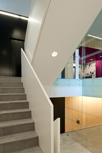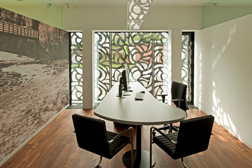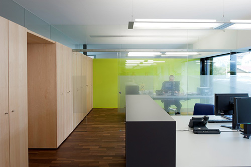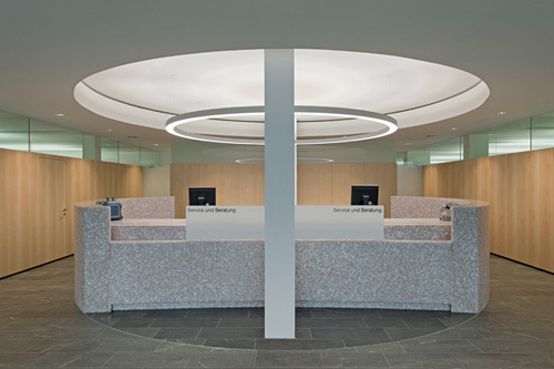 Der im Untergeschoss liegende Tresorraum wurde über einen Lichthof in das Raumkonzept eingebunden und erhielt einen vorgelagerten, flexibel nutzbaren Lounge-Bereich. Zur vertikalen Verbindung zwischen Tresorraum und Tiefgarage im Untergeschoss und den Verwaltungsbüros in den Obergeschossen wurde im Norden ein eigenständiges Erschließungselement errichtet – ein frei stehender Turm, der sich zur Straßenseite hin als Werbeträger für die Bank präsentiert. Die Außenbereiche wurden ebenfalls neu gestaltet, eine großzügige Treppenanlage und ausreichende Parkplätze vermitteln dem Bankkunden willkommen zu sein. (Text: Architekten; redakt. bearbeitet von Claudia Wedekind)