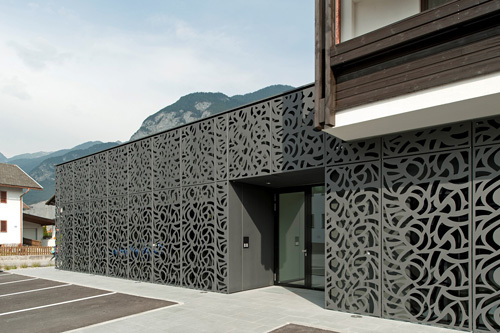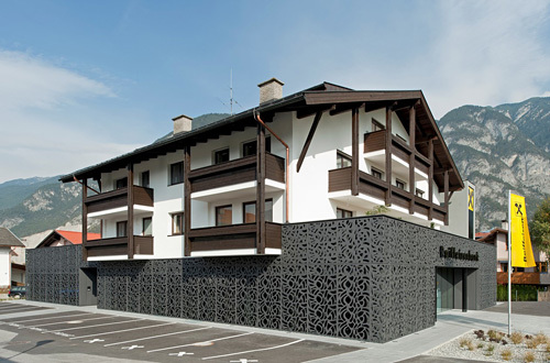 Der aus den 1960er Jahren stammende, viergeschossige Baukörper der Raiffeisenbank Kematen liegt am östlichen Rand des Ortes, unmittelbar an der Bundesstraße. Neben dem Erdgeschoss werden auch Teile der beiden Obergeschosse von der Bank genutzt, außerdem sind im Gebäude eine Ordination und drei Wohnungen untergebracht. Das aus einem Wettbewerb hervorgegangene Projekt der Architekturhalle besteht zum einen in einer ebenerdigen Erweiterung der Bank, zum anderen in einer neuen, von den übrigen Nutzungen abgetrennten Erschließung der in den übrigen Geschossen verteilten Bankräume.Das nach Westen erweiterte Erdgeschoss wurde zu einer Sockelzone umgestaltet, die sich optisch klar vom restlichen Gebäude absetzt. Anthrazit-farbige, reflektierende Stahlpaneele umfassen rundum die Eingangsebene, die damit klar als Bankbereich sichtbar gemacht wird. Mit einer ausgeschnittenen Ornamentstruktur sind die Paneele zugleich Sicht- und Sonnenschutz für die dahinter liegenden Räume. Eine große Öffnung im Osten markiert den Eingang in die Bank und führt den Kunden weiter in eine großzügig dimensionierte, lichtdurchflutete Schalterhalle mit einem kreisförmigen Kassabereich im Zentrum. Beidseitig der Schalterhalle liegen Beratungs- und Teamräume, im hinteren Bereich befindet sich die Geschäftsleiterzone. Die in Ahorn gestalteten Trennwände reichen nicht ganz bis zur Decke, womit das Erdgeschoss ist als optisch zusammenhängender Großraum erlebbar ist.